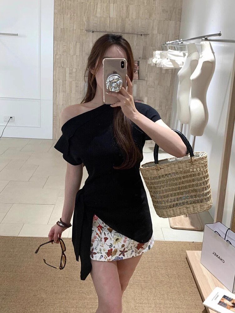 韩系一字领杏色斜肩短袖t恤女夏季不规则系