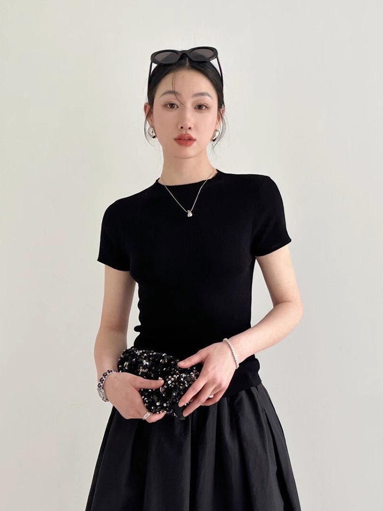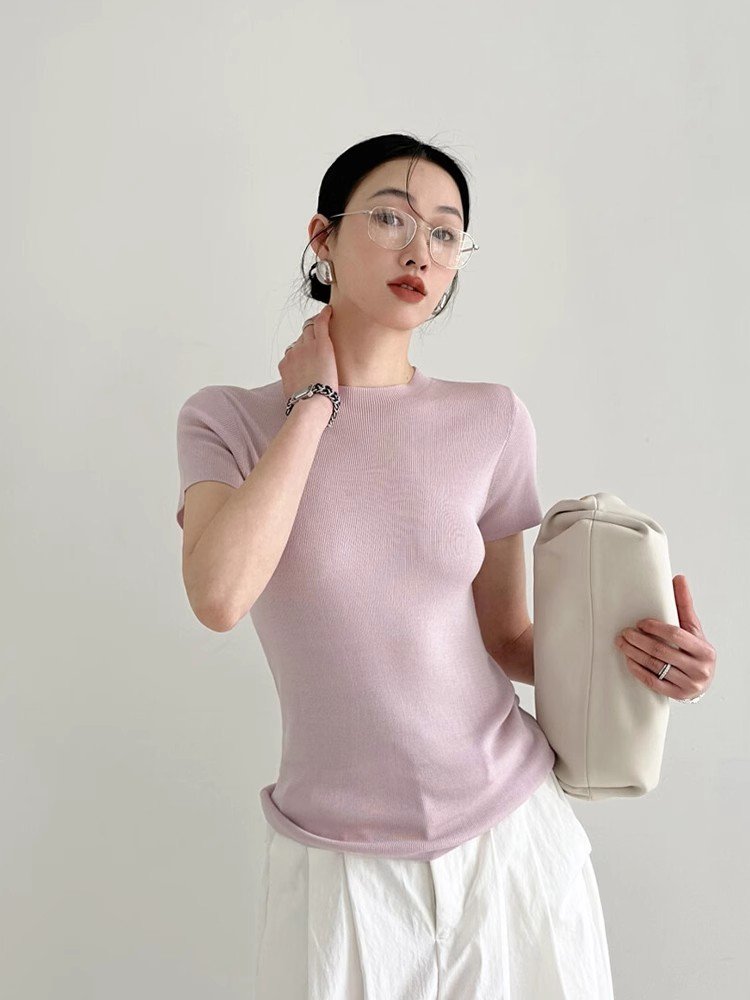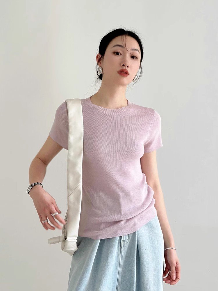 法式气质粉色冰丝针织短袖正肩t恤女夏季小