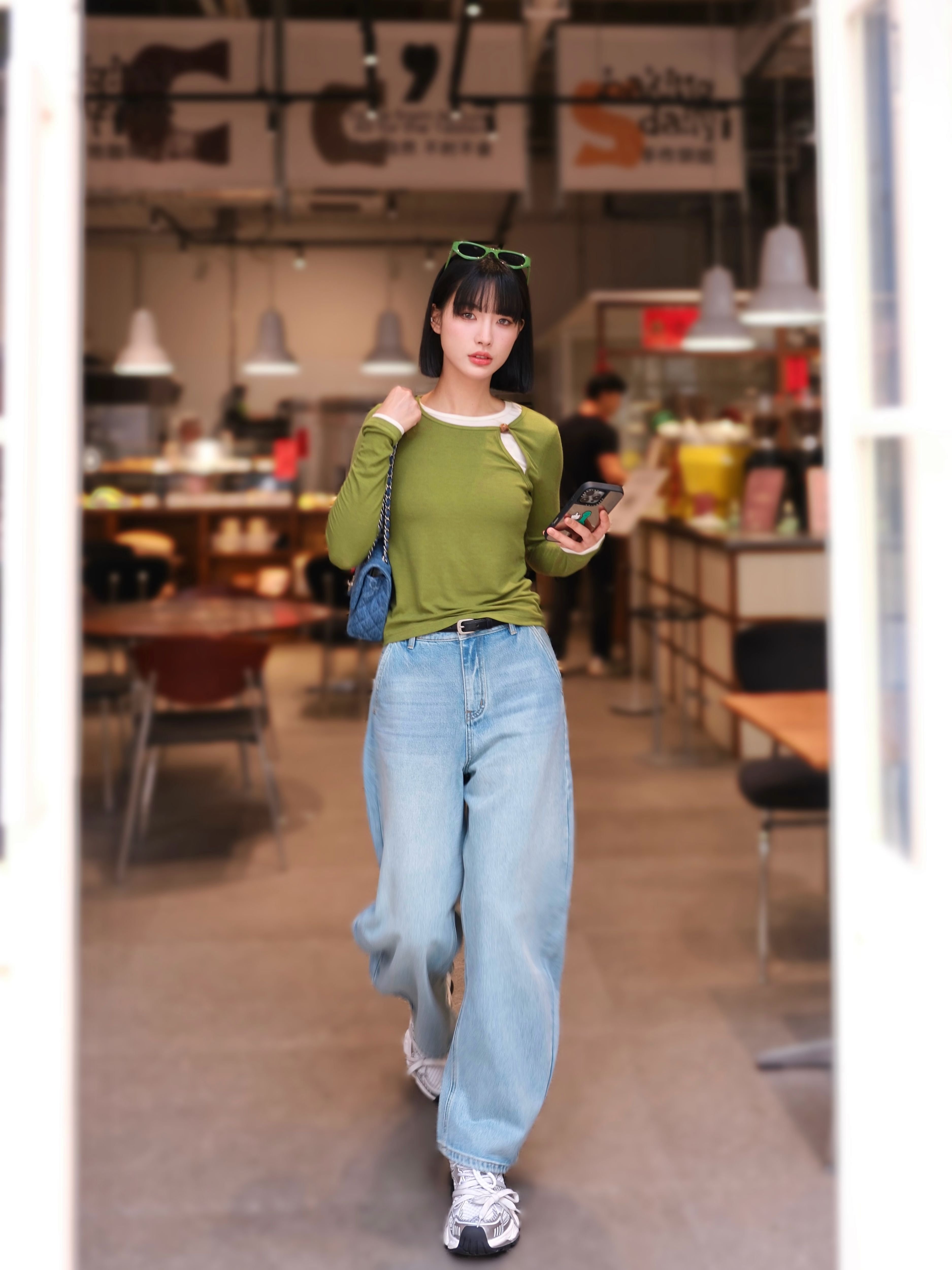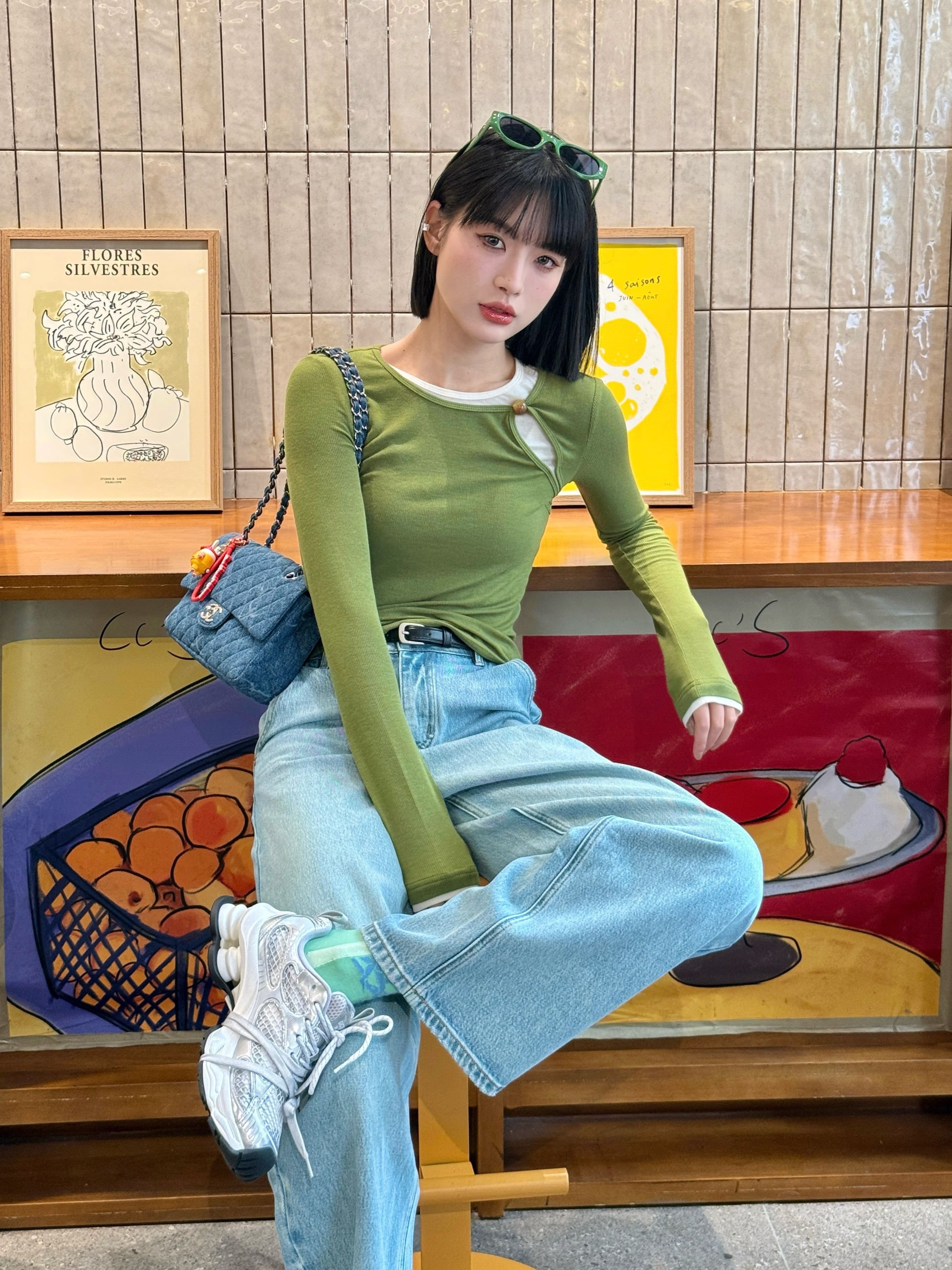 韩系绿色假两件长袖正肩t恤女春秋小个子内