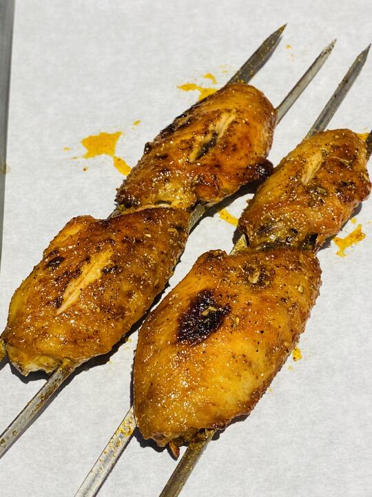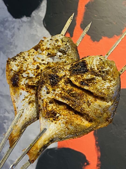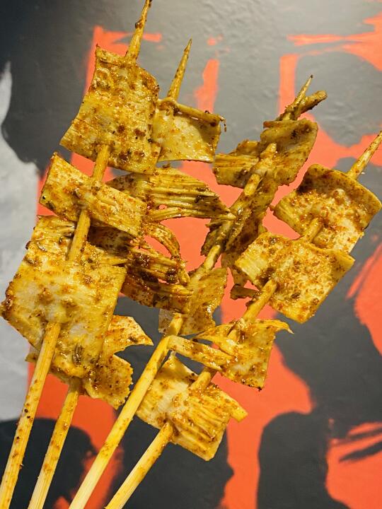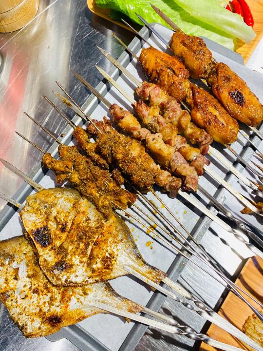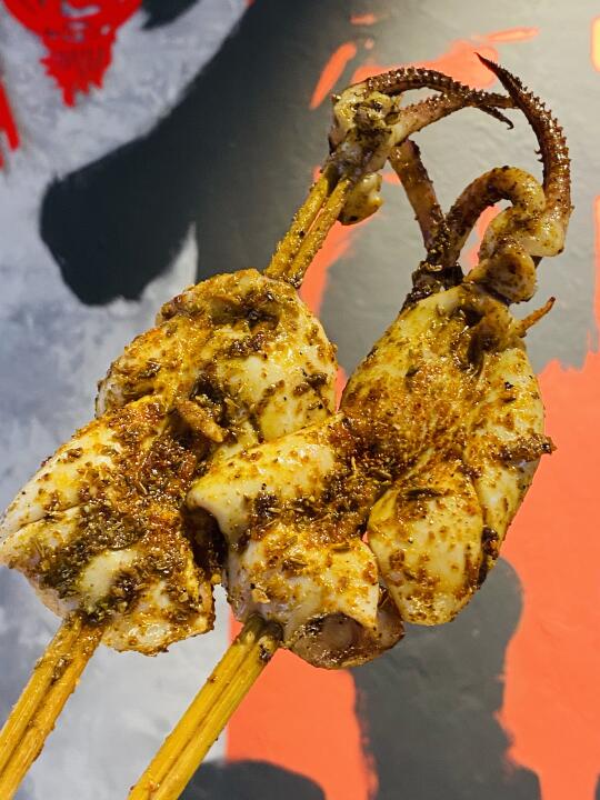🦑整只大鱿鱼却烤得特别嫩,汁水丰富!🐔鸡翅的皮烤得略焦,挺香的!🐟鲳鱼处理得蛮干净的。🐂牛板筋特别有嚼劲,适合下酒!