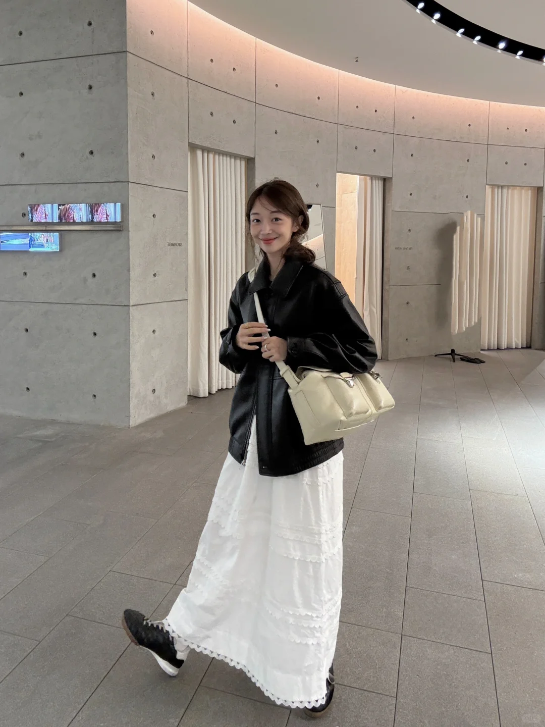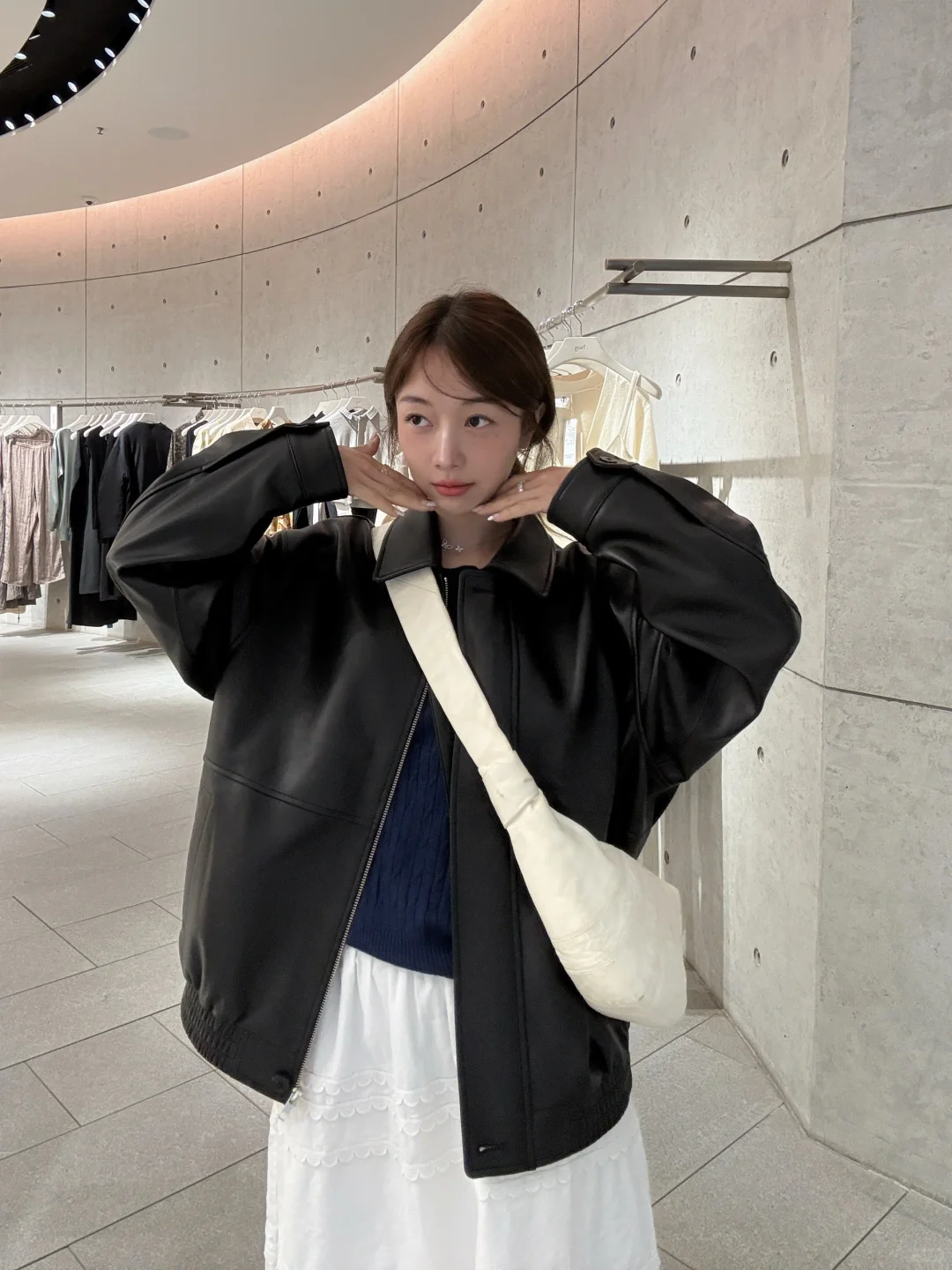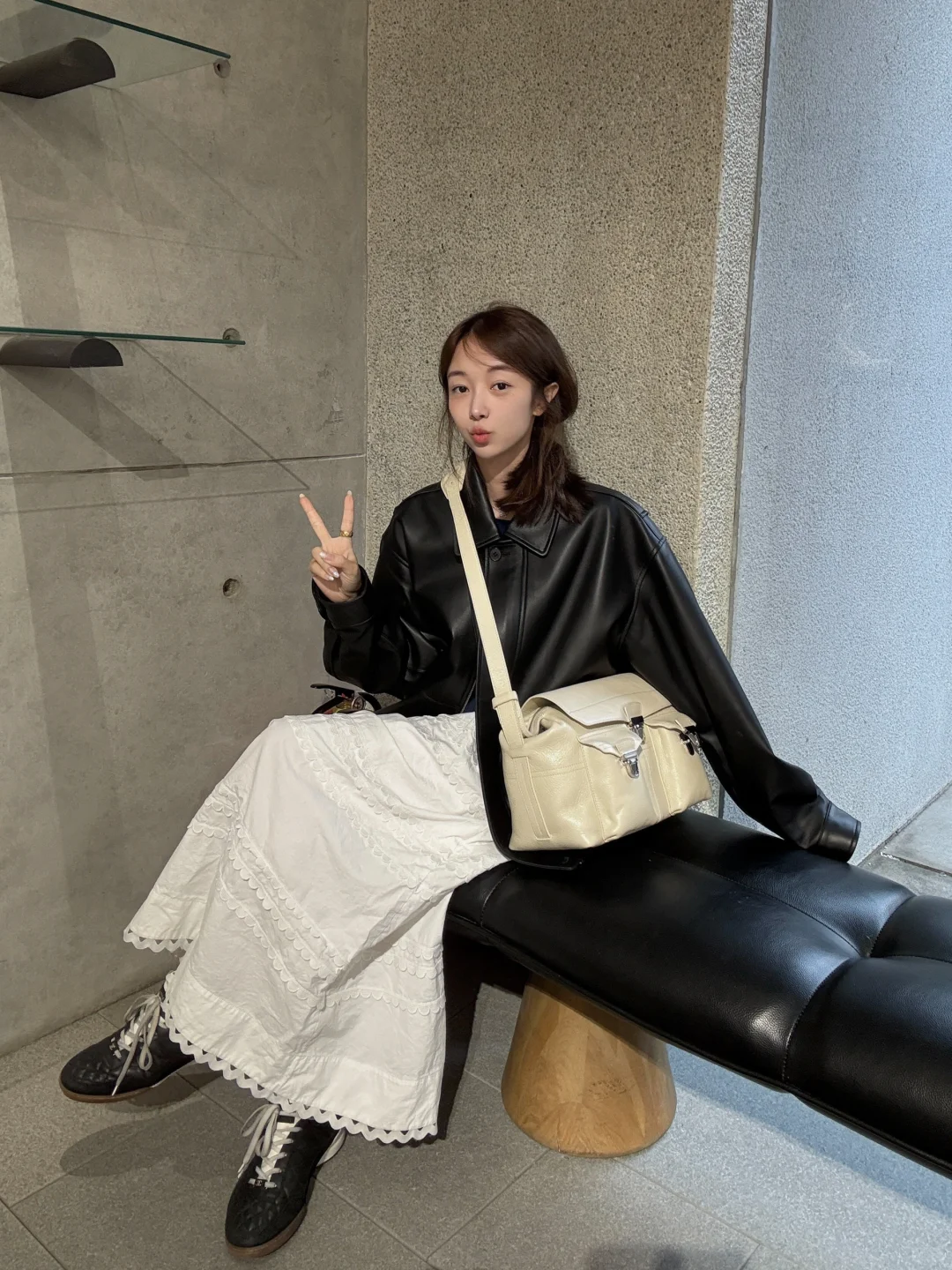 皮衣配白半裙