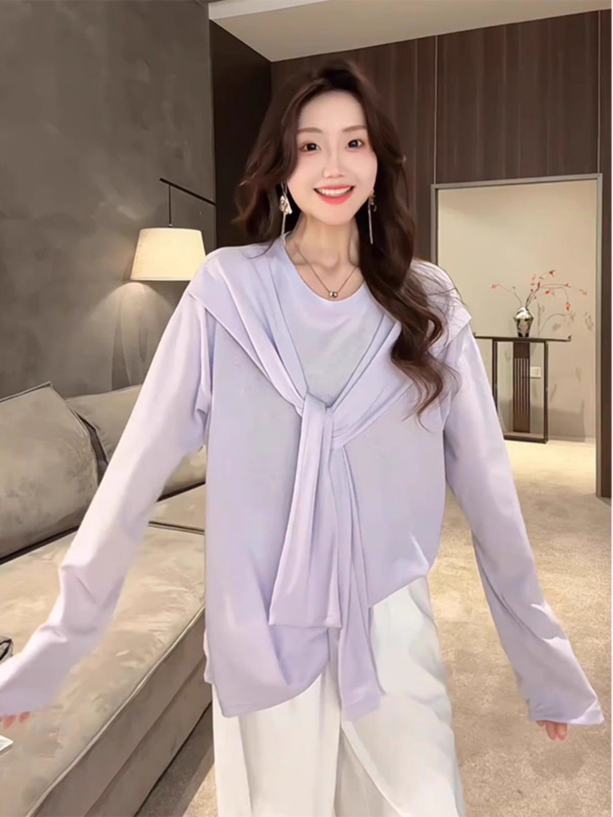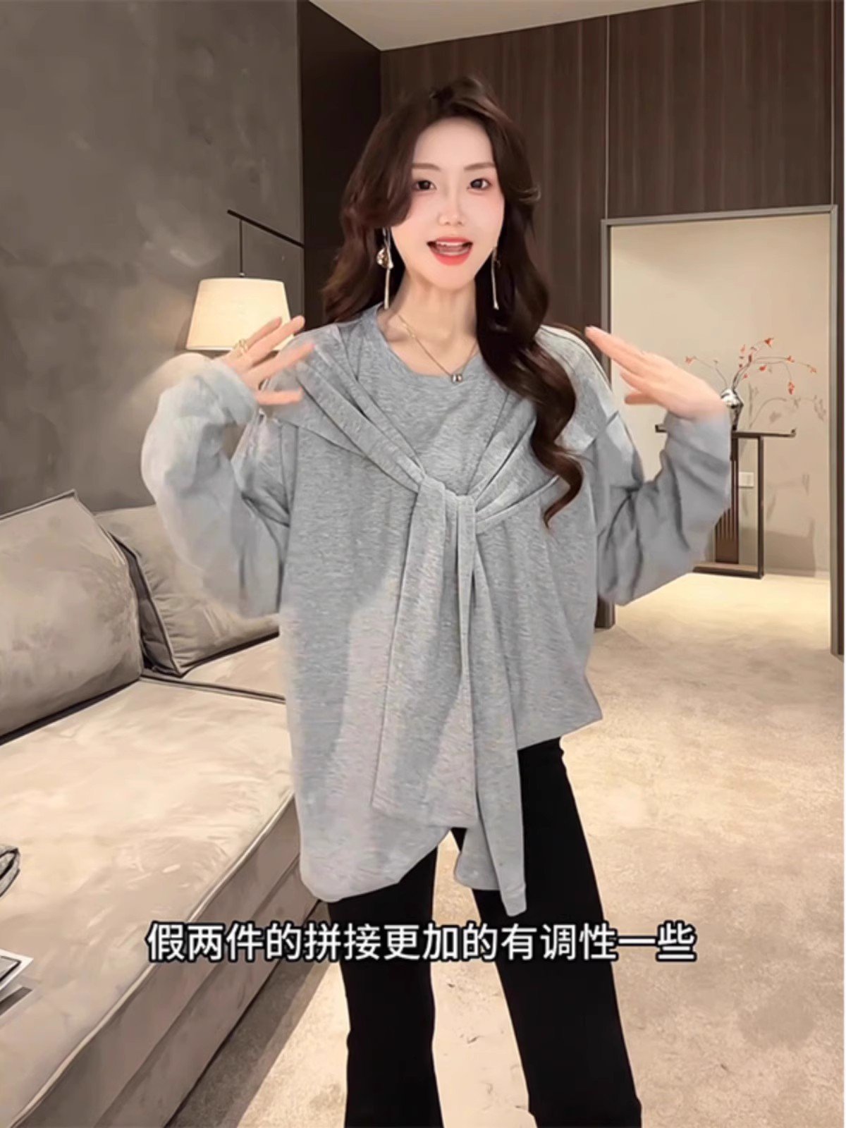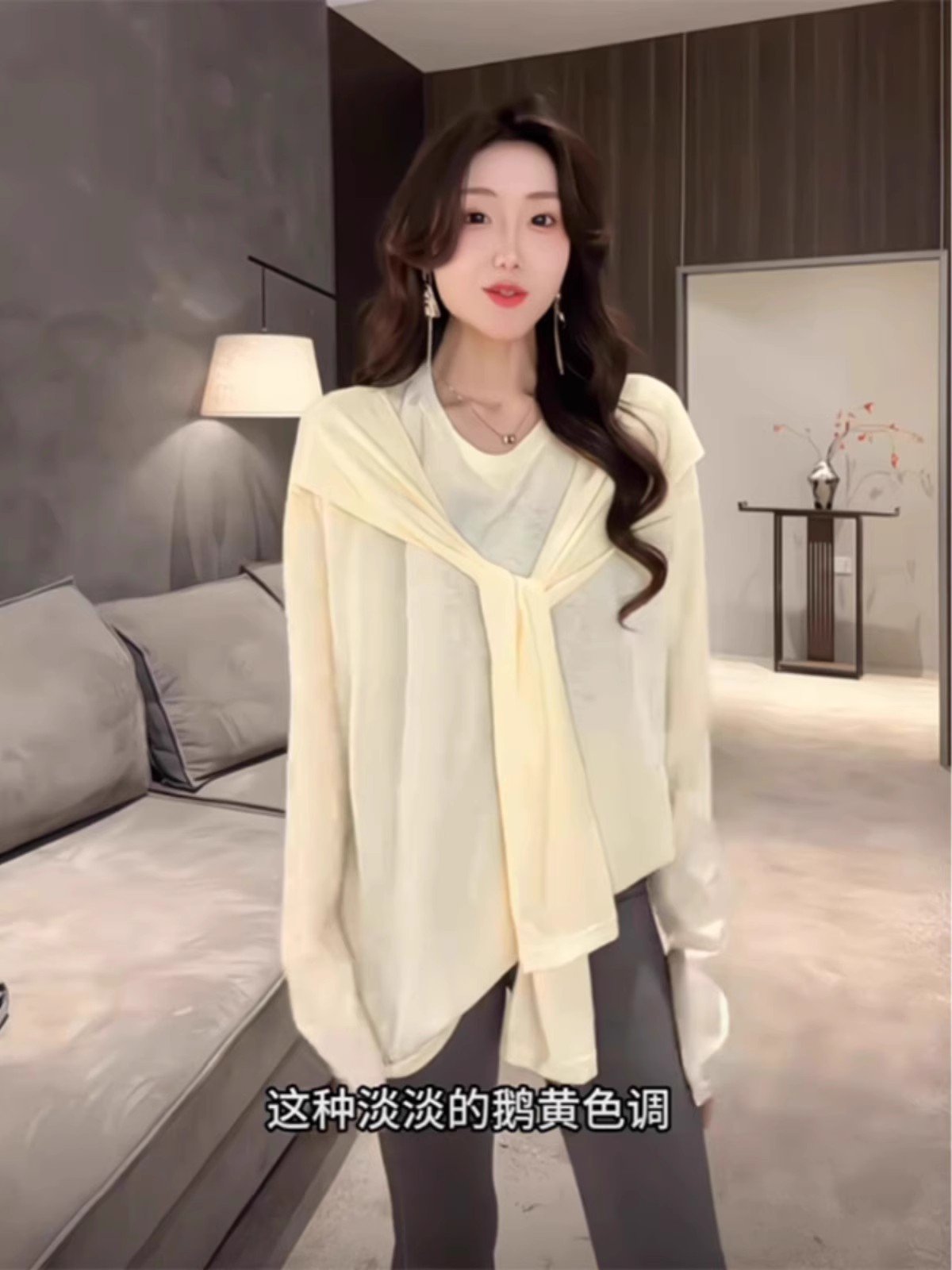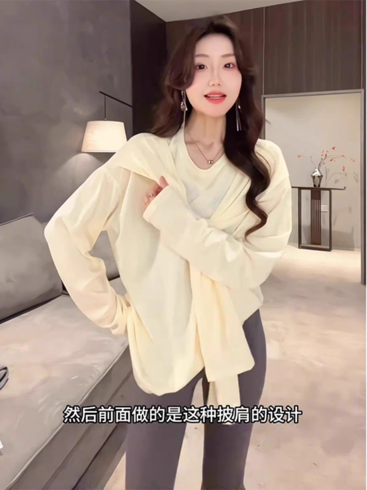 韩系黄色假两件长袖正肩t恤女夏季慵懒风宽
