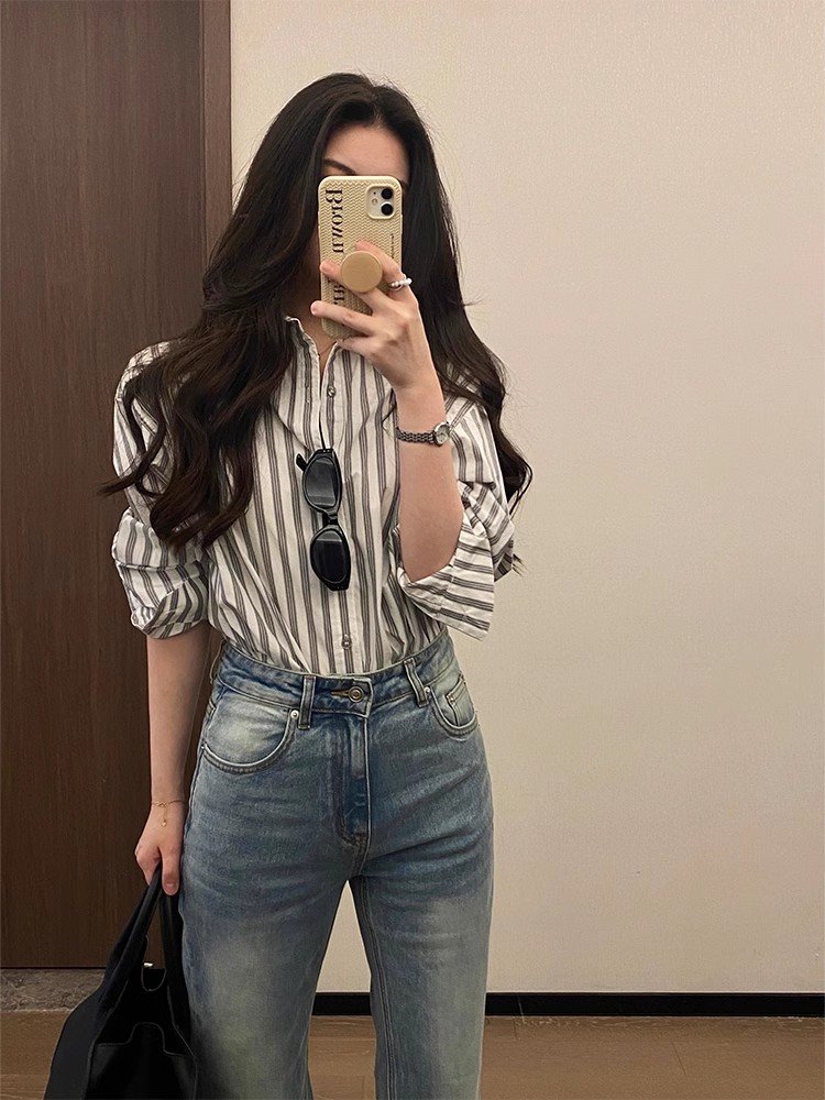 法式气质撞色条纹POLO衫衬衫女早春季小