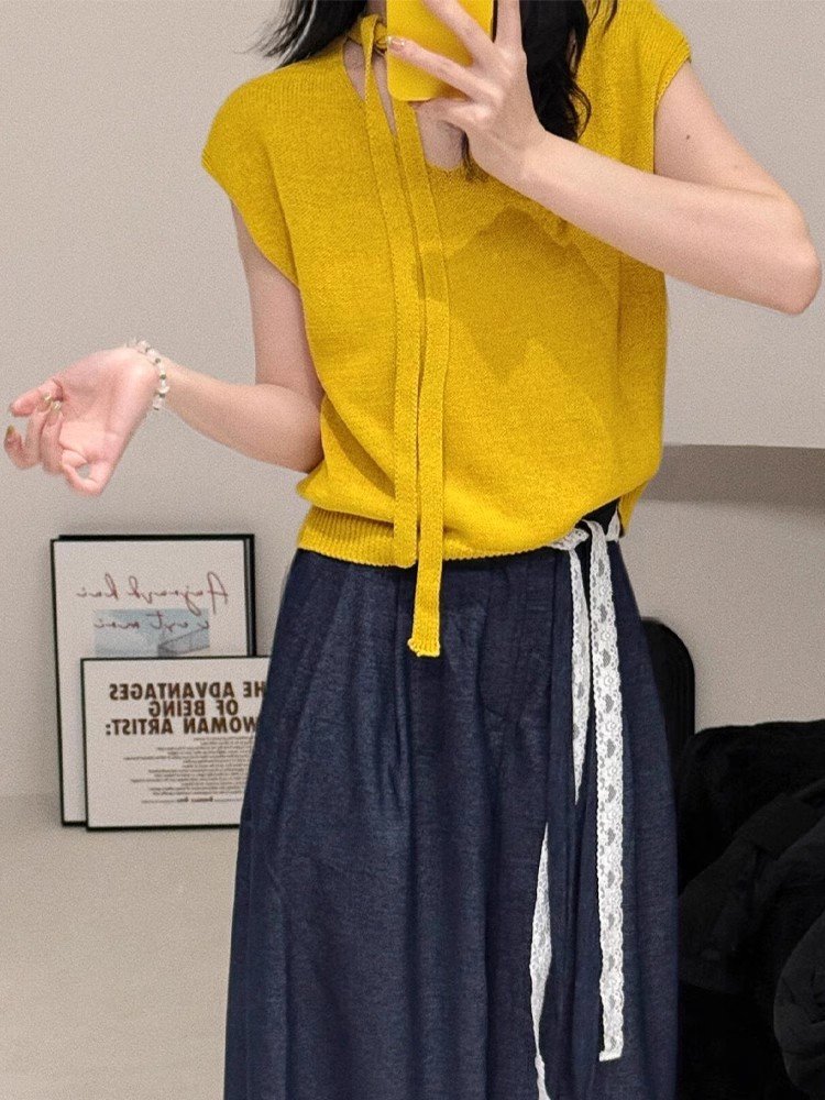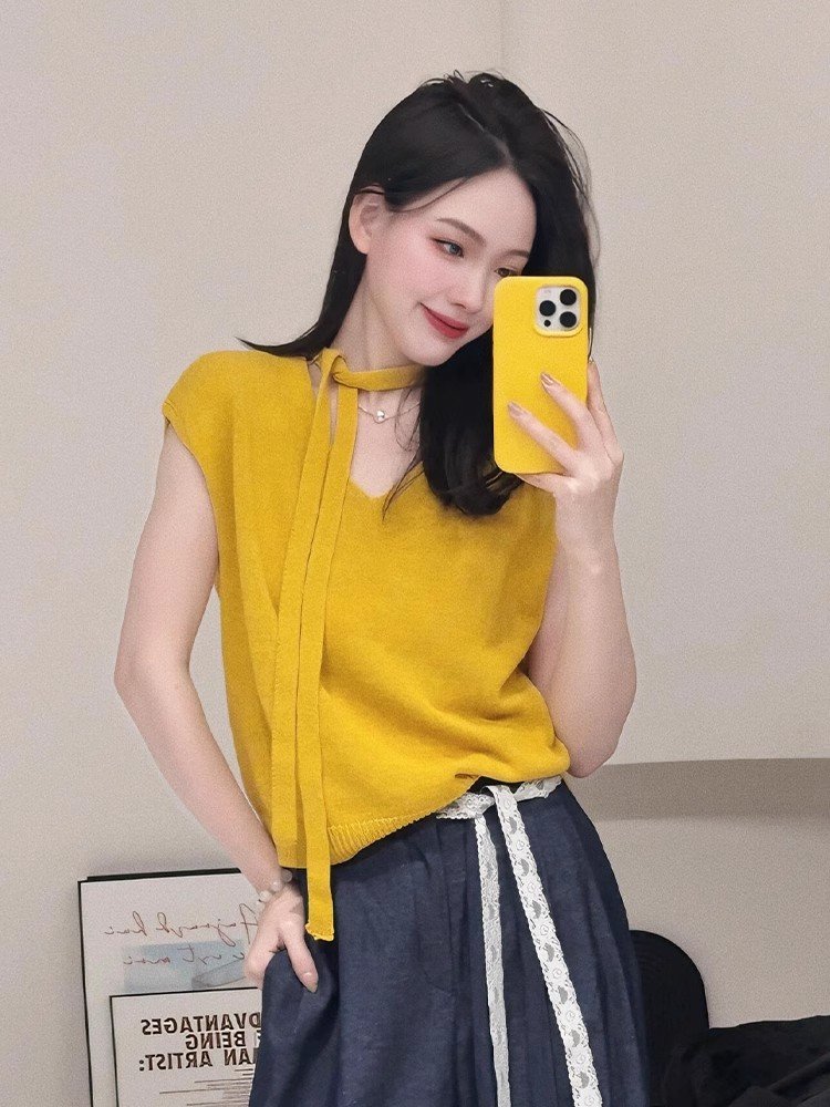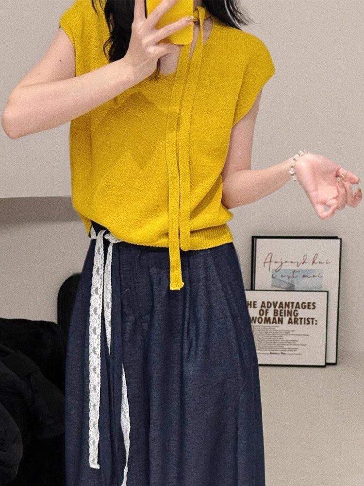 韩系黄色挂脖飞飞袖短款正肩女上衣小个子冰