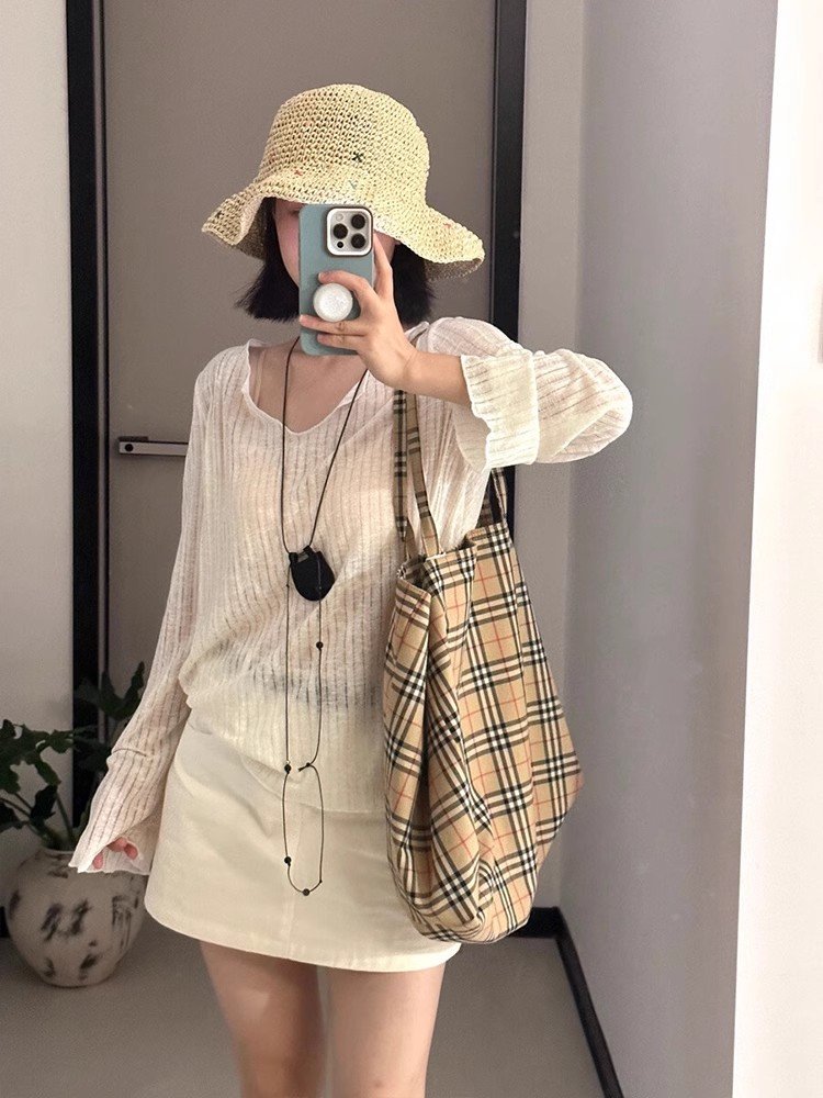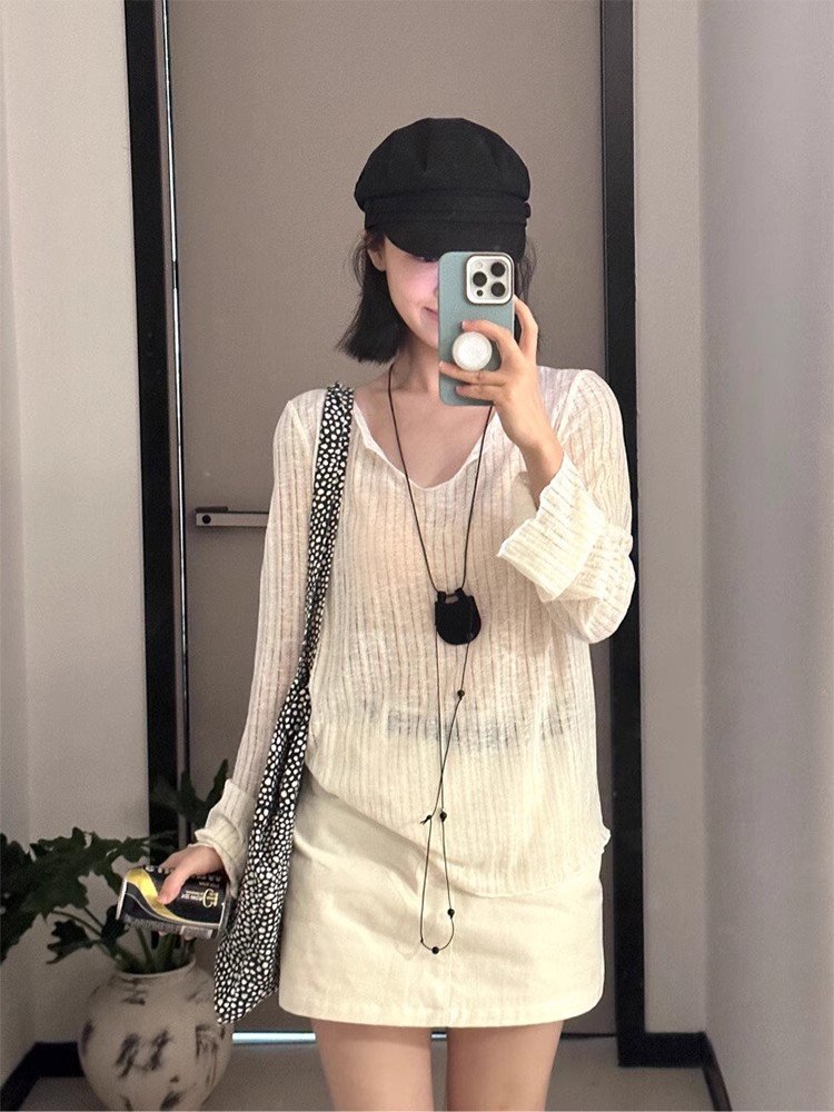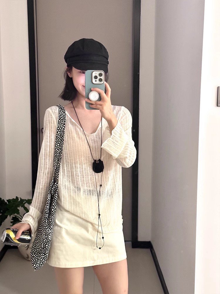 韩系杏色v领冰丝针织防晒空调衫女夏季吊带