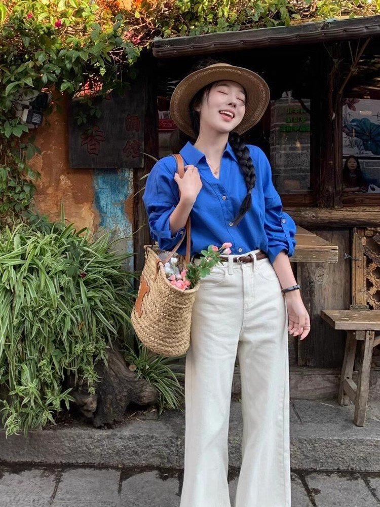 轻奢高级感克莱因蓝polo领开衫衬衣女早