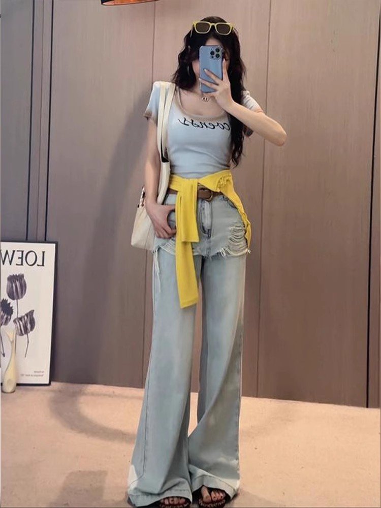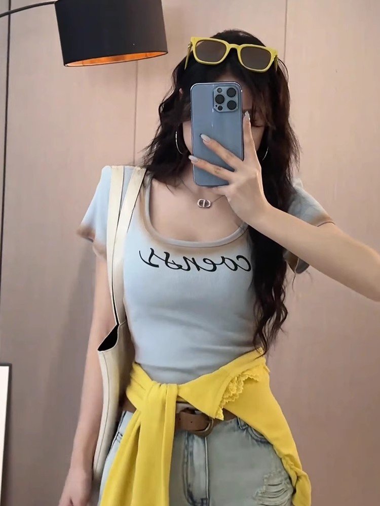 韩系chic甜辣蓝色方领字母印花短袖t恤