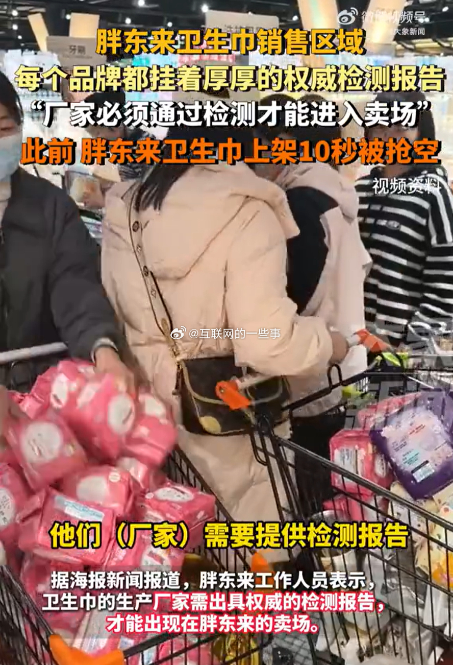 胖东来在卫生巾销售区挂出各品牌权威检测报告,消费者可现场查阅。此前,胖东来卫生巾上架仅10秒就被抢空。