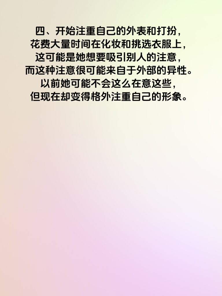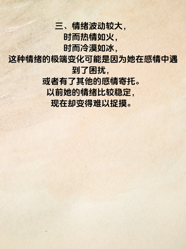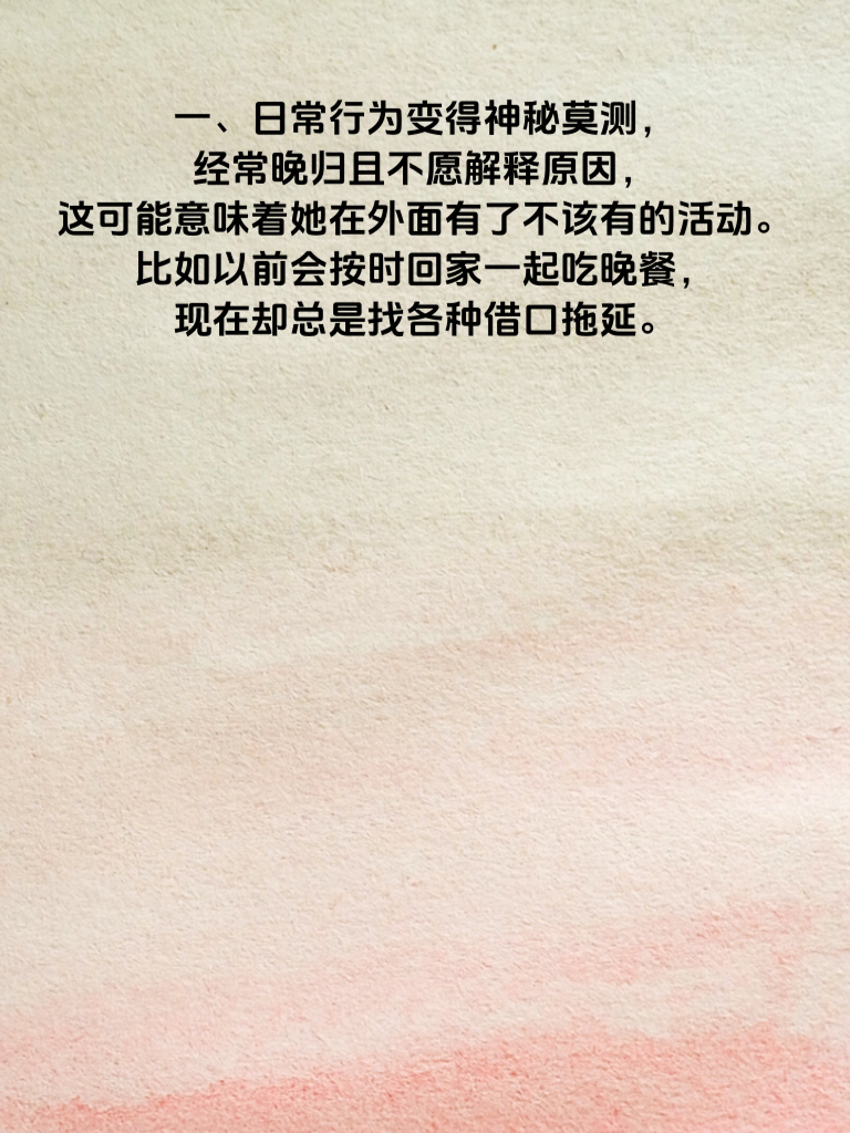 一、日常行为变得神秘莫测,经常晚归且不愿解释原因,这可能意味着她在外面有了不该有的活动。比如以前会按时回家一起吃晚餐,现在却总是找各种借口拖延。 二、对手机和社交账号过度保护,频繁锁屏或拒绝让你查看,这往往暗示着她可能在与其他人进行秘密的交流。以前会大方地让你看手机,现在却变得格外敏感。 三、情绪波动较大,时而热情如火,时而冷漠如冰,这种情绪的极端变化可能是因为她在感情中遇到了困扰或者有了其他的感情寄托。以前她的情绪比较稳定,现在却变得难以捉摸。 四、开始注重自己的外表和打扮,花费大量时间在化妆和挑选衣服上,这可能是她想要吸引别人的注意,而这种注意很可能来自于外部的异性。以前她可能不会这么在意这些,但现在却变得格外注重自己的形象。