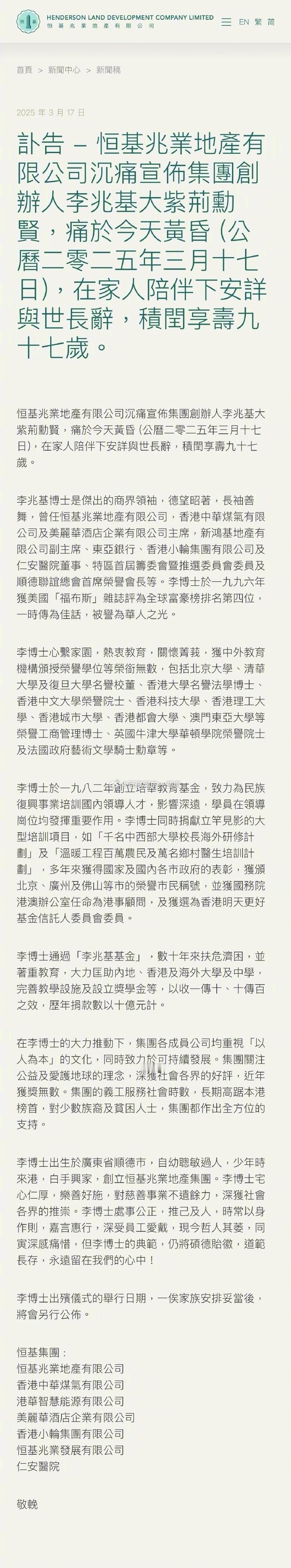 3月17日,香港恒基地产集团创办人李兆基先生逝世,享年97岁。