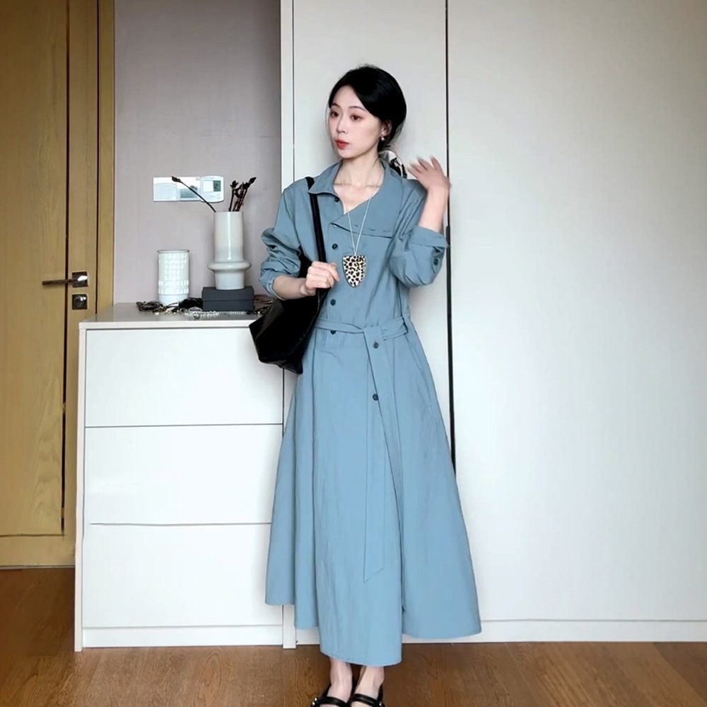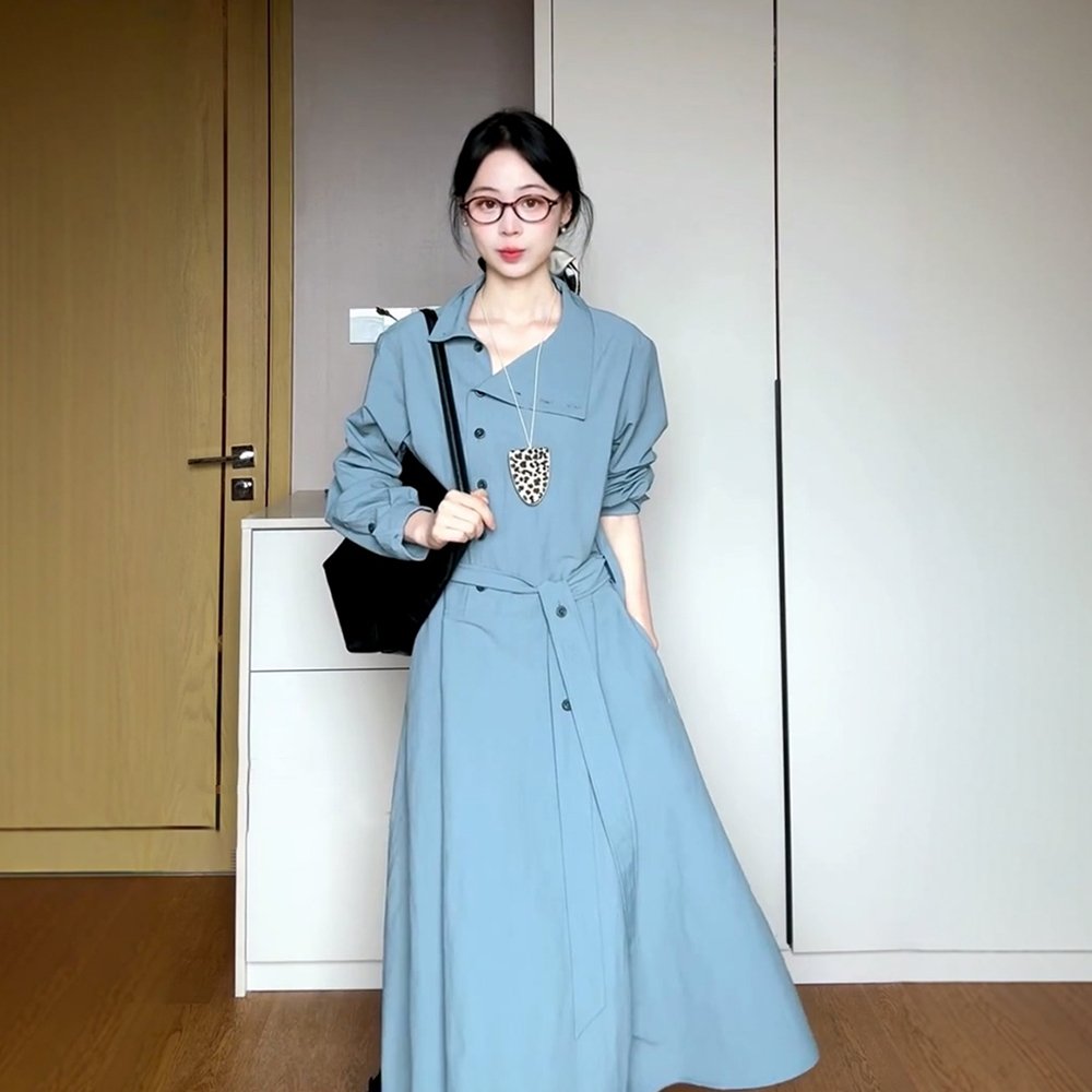 蓝色翻领连衣裙女高级感超好看长裙系带裙子