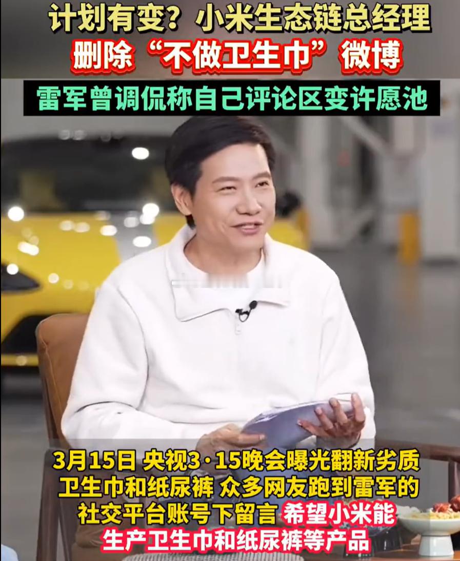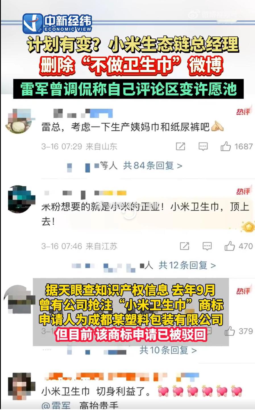 网友们又来“逼”雷总创业了!陈总删了不做卫生巾的微博。现在卫生巾质量参差不齐,女