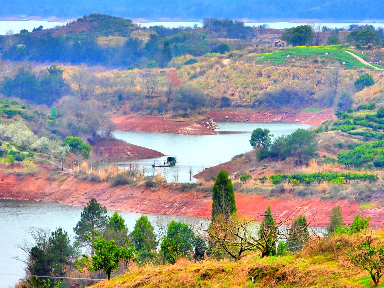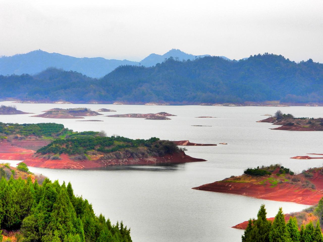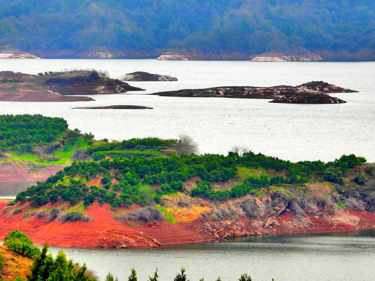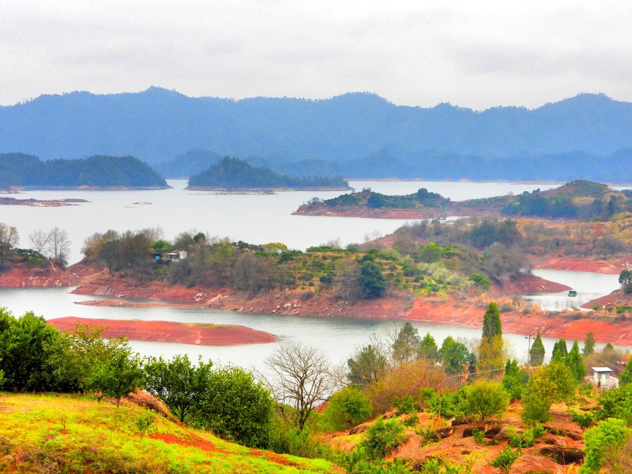 千岛湖环湖自驾梅里村观景台上眺望千岛湖。在淳杨公路上有一处观景平台,站在这里可以一览湖中千岛的壮丽景观。由于湖水不是很丰盈,露出了部分滩涂,滩涂的颜色是红的,让景色更添加了一份美丽。