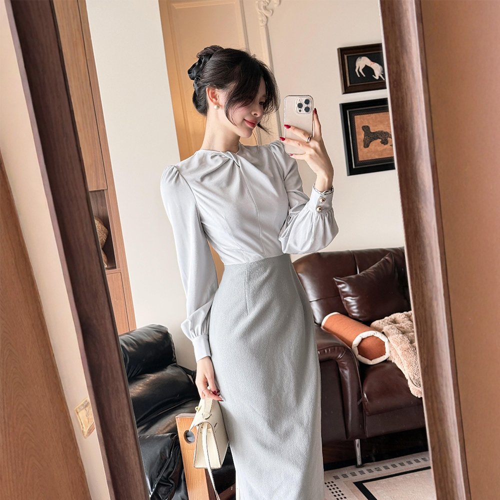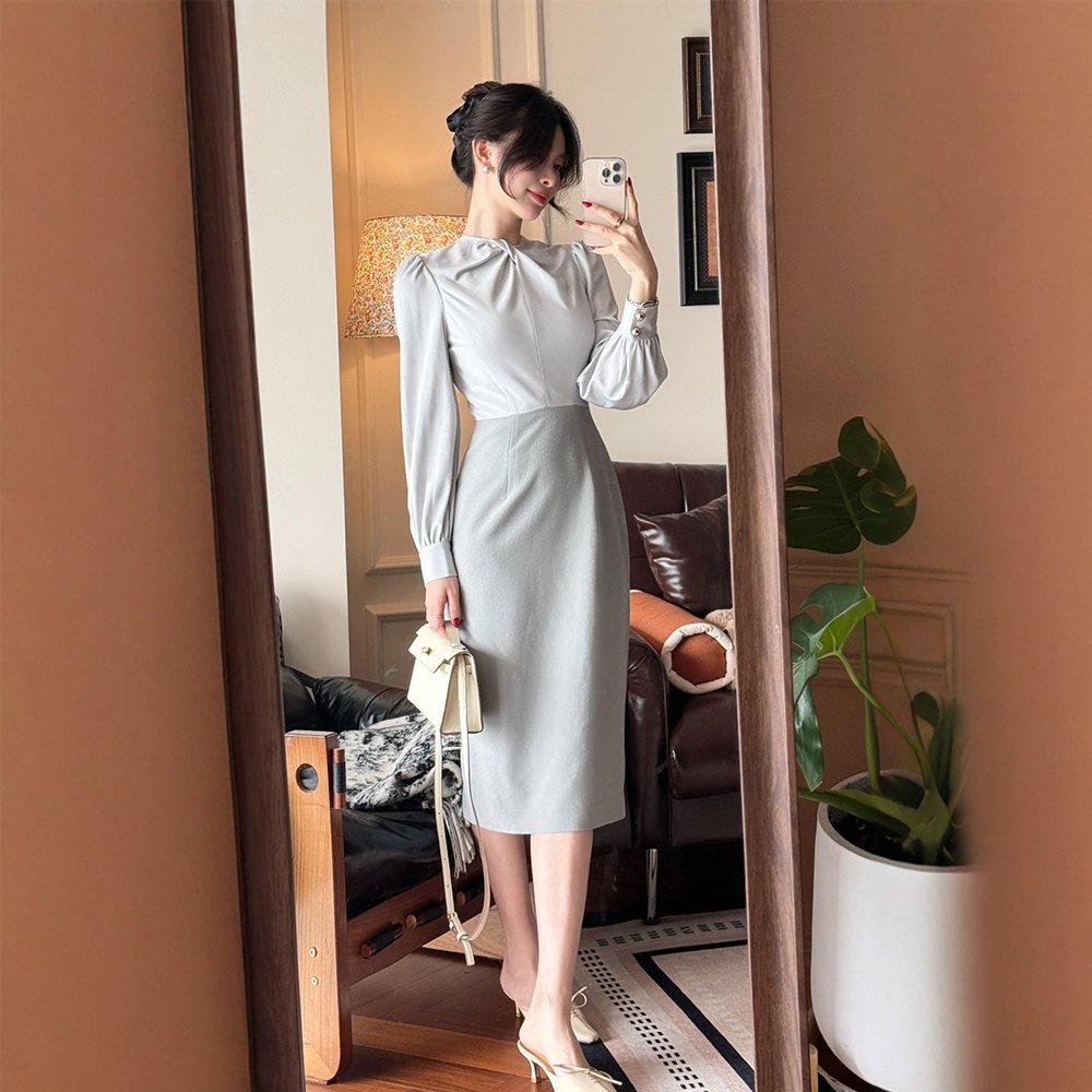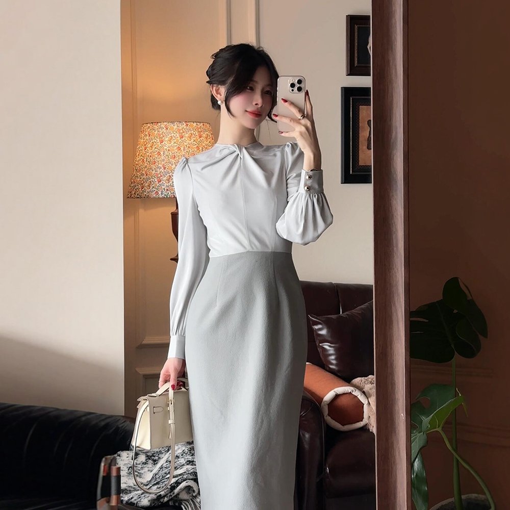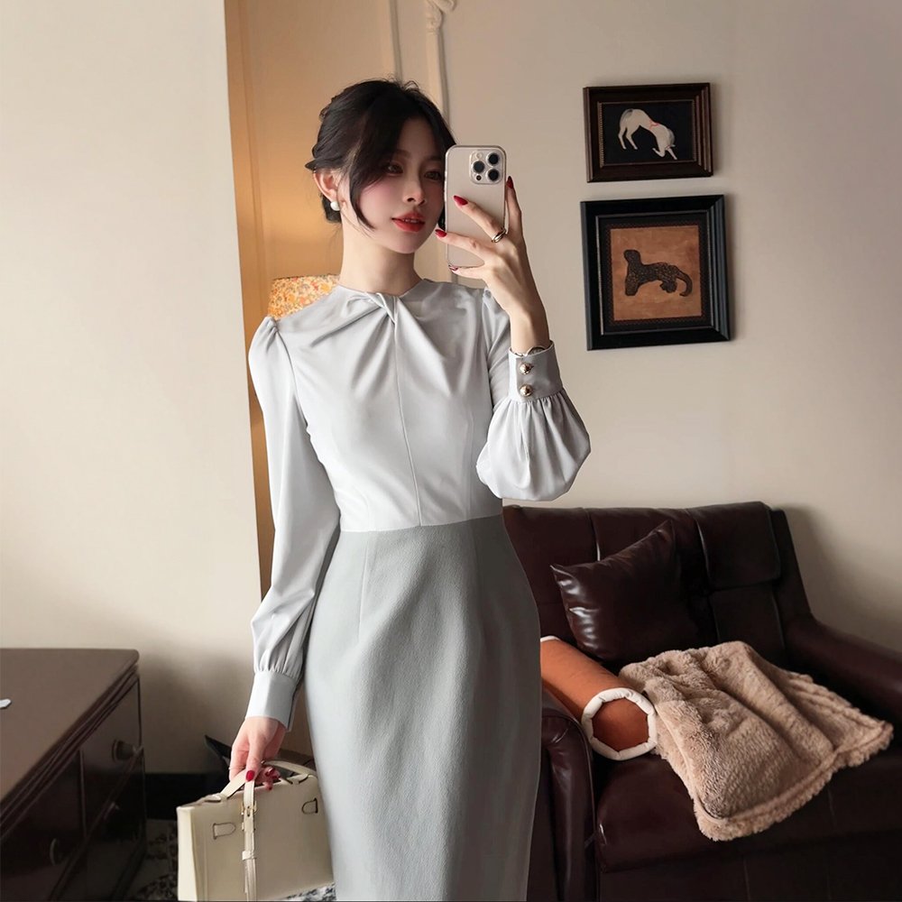 漂亮超好看法式撞色拼接连衣裙时尚收腰长裙