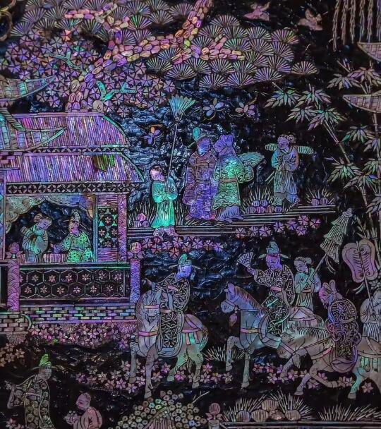 -视觉效果:贝片在光线折射下呈现五彩斑斓的虹彩光泽,具有“天然宝石”般的质感,常用于表现花鸟、人物、亭台楼阁等主题。