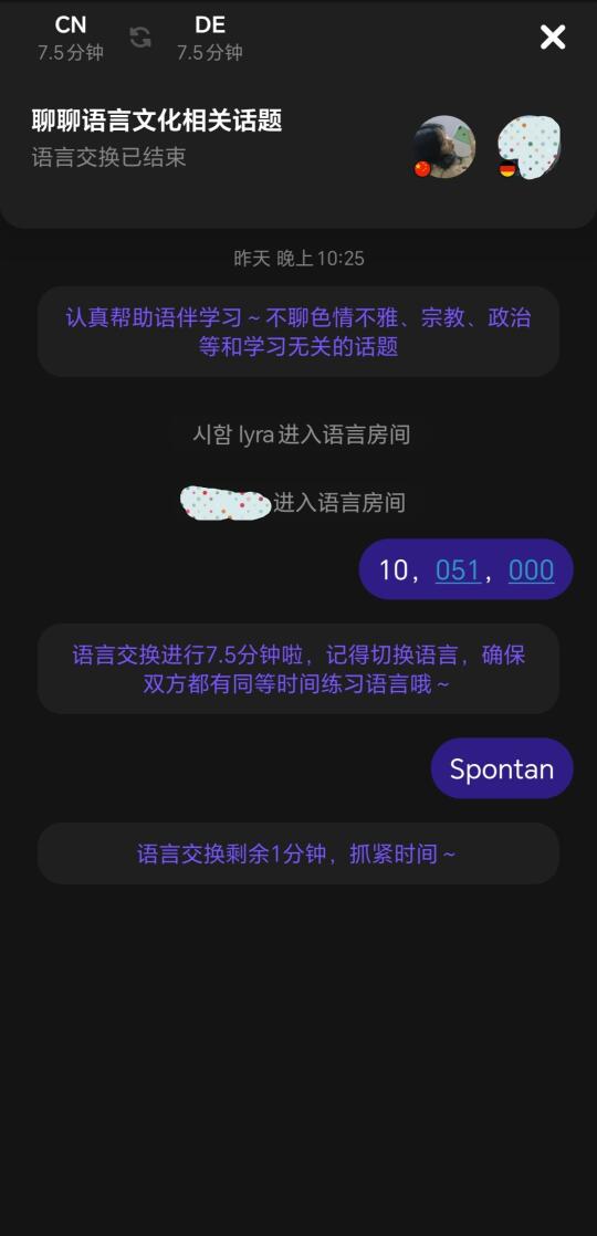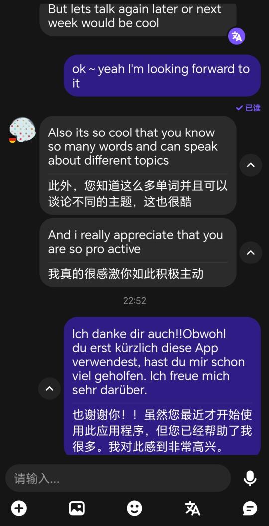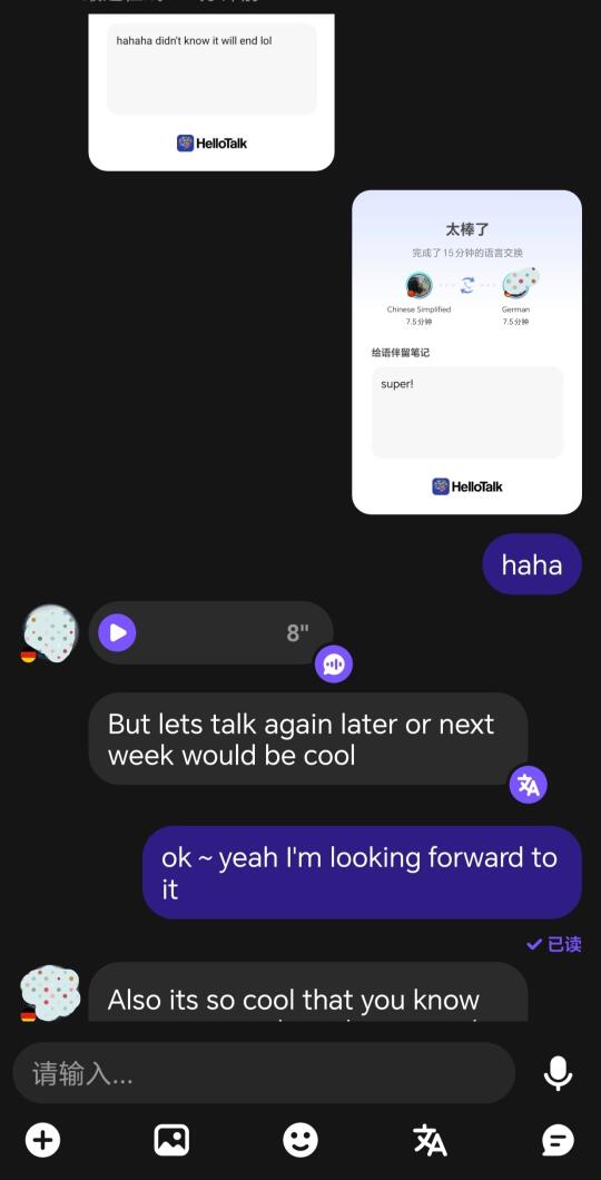 昨天给一个德国小哥哥发了一个语言交流,他刚下这个软件还不会玩,我给他发送了一个邀请[笑哭R](大概就是接入电话同时可以打字)