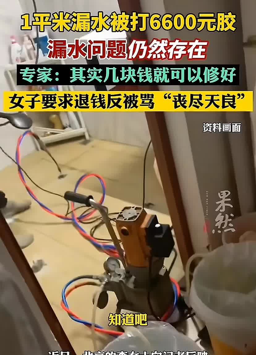 北京一女子因为家中漏水,网上找补漏师傅来维修,一平米的漏水地方被打了6600块钱的胶水,但是仍然没有解决漏水的问题,有行业专家称就几块钱就能修好,女子就是当了冤大头。 6600块钱都可以把一平米的地方重新整修了,女子花了6600块钱还没能把家里漏水的地方维修好,说到底就是被维修师傅忽悠了,那个胶水确实贵,但是没有正确的使用到地方,6600块钱,维修师傅可是能拿不少分成。 女子要去退款反被维修师傅骂,这6600块钱真的花得很委屈。对于女主遭遇,不少网友觉得是内行欺负外行,这名维修师傅就是宰客太狠了,几块钱就能解决的事情,非要给同行抹黑了。