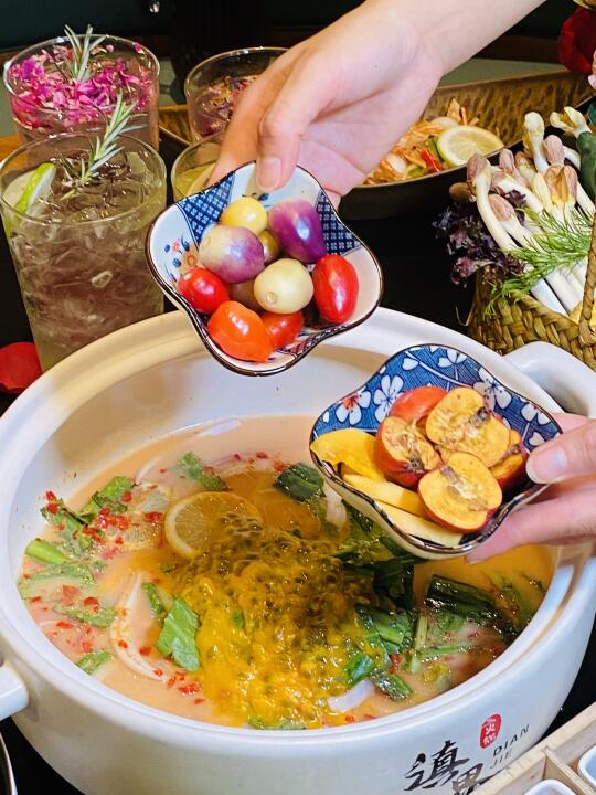 这个锅底真绝!新鲜百香果,加上🍒山楂、🍅云南的番茄、🌶️彩色小辣椒,色彩丰富,如莫奈的花园,美得像一幅画!😍😍😍味道酸爽至极,一发入魂!!!