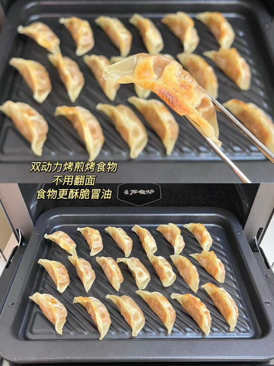 💥我还很喜欢用到它双动力烤,不用翻面,也能让食物全方位均匀受热!早上做个煎饺太方便了,煎烤出来的煎饺更酥脆冒油!口感比外面买的好多了!