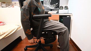 先说说6D联动扶手,这是我打游戏时的“救星”。它支持升降、前后滑动、左右旋转,甚至能90°垂直内旋。打MOBA类游戏时,我需要把胳膊架在扶手上操作鼠标,这时把扶手调到和桌面齐平的高度,再向内旋转15°,胳膊能完全贴合扶手,不会有悬空的酸痛感;打字时又能把扶手调低,让手臂自然下垂,避免耸肩。之前用固定扶手的椅子,打1小时游戏肩膀就会酸,现在连续玩2小时,胳膊还是放松的状态。