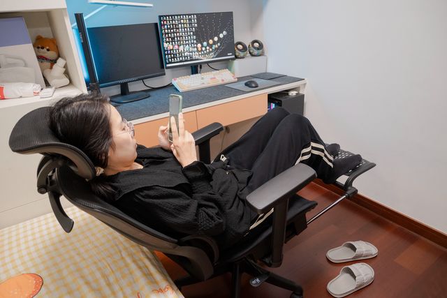 最惊喜的是145°超大后仰+隐藏式腿托的组合,完美解决了“办公室午休难”的问题。之前午休只能趴在桌子上,醒来后胳膊麻、脖子酸;现在把椅子后仰到130°左右,拉出隐藏在坐垫下方的腿托,再调整头枕的角度,就能形成一个“半躺”的姿势。