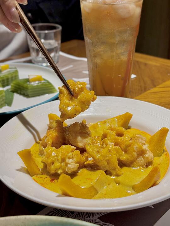 谁懂啊姐妹们![偷笑R] 这家店直接把清迈搬进市中心了! 满屋绿植+藤编吊灯+原木桌椅, 连服务员都穿着泰式花衬衫哈哈~ 随手一拍就是ins风九宫格📸 🔥饭点来晚1秒都要排队! 🦐金栗咖喱虾球真的绝! 大颗虾球裹满浓郁咖喱酱, 混着南瓜的香甜, 拌饭能炫三碗! 🍍菠萝炒饭用料太实在了! 虾仁腰果肉松堆成山, 挖到底还有爆汁菠萝粒, 酸甜口太解腻啦~ 💚千层斑斓糕美到舍不得吃! 翡翠绿渐变美哭我! 椰香+斑斓清香在嘴里打架, 糯叽叽星人狂喜!