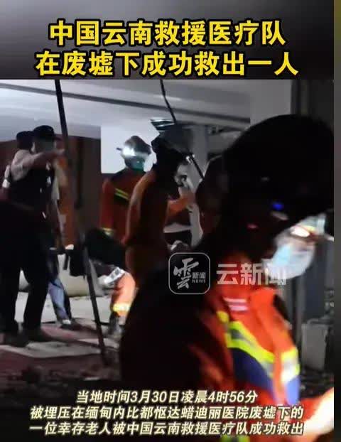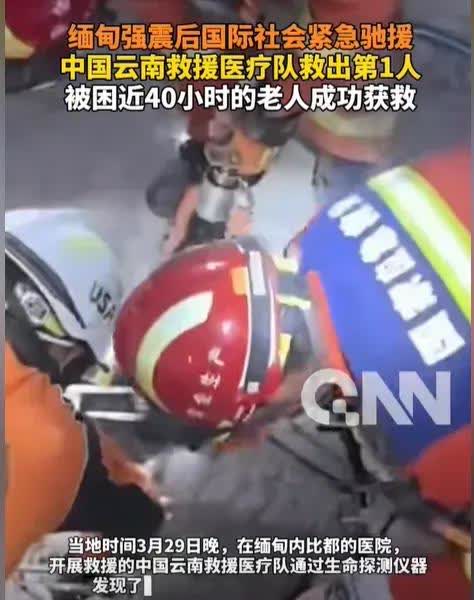 云南救援队废墟下挖出生还老人,大国风范让人泪目! 3月30日凌晨,云南救援队可干了件大事!他们用生命探测仪,在医院废墟下发现了生命迹象,那意思就是,下面有人还活着! 可这救援,难啊!废墟堆得像山一样,但咱救援队不慌,先上后下,后清前出,一套操作下来,4个小时,人给挖出来了! 你猜怎么着?是位老人,被困了近40个小时!想想都吓人,但老人看到中国救援队那一刻,眼泪止不住地流,心里肯定在想:这就是世界上最伟大的人啊! 冒着生命危险来救我,这不就是人间大爱,大国风范嘛!看得我也热泪盈眶,咱中国人,就是牛!我觉得啊,这救援队就是咱们的骄傲,他们的每一次出手,都让世界看到了中国的力量和温暖!