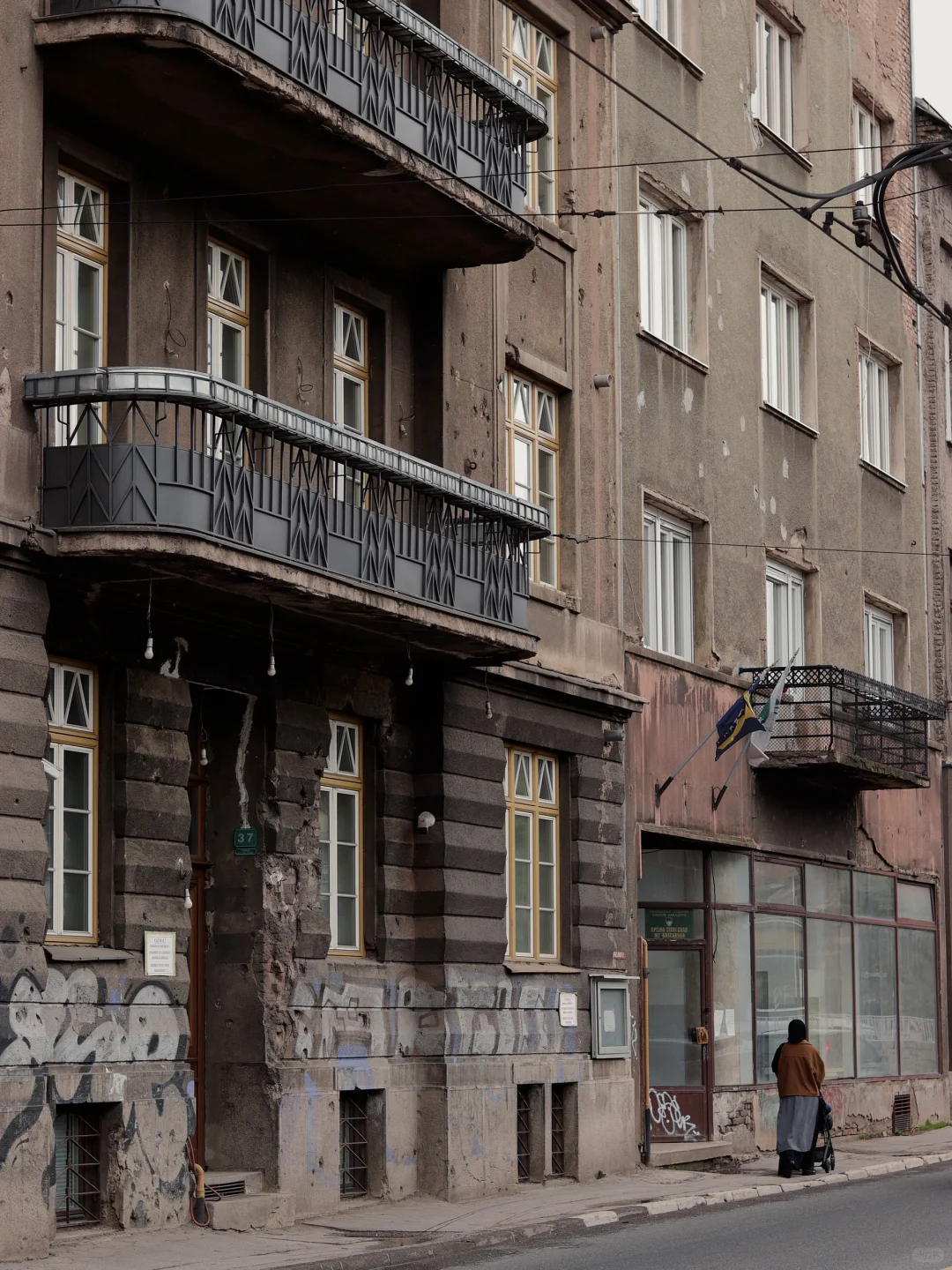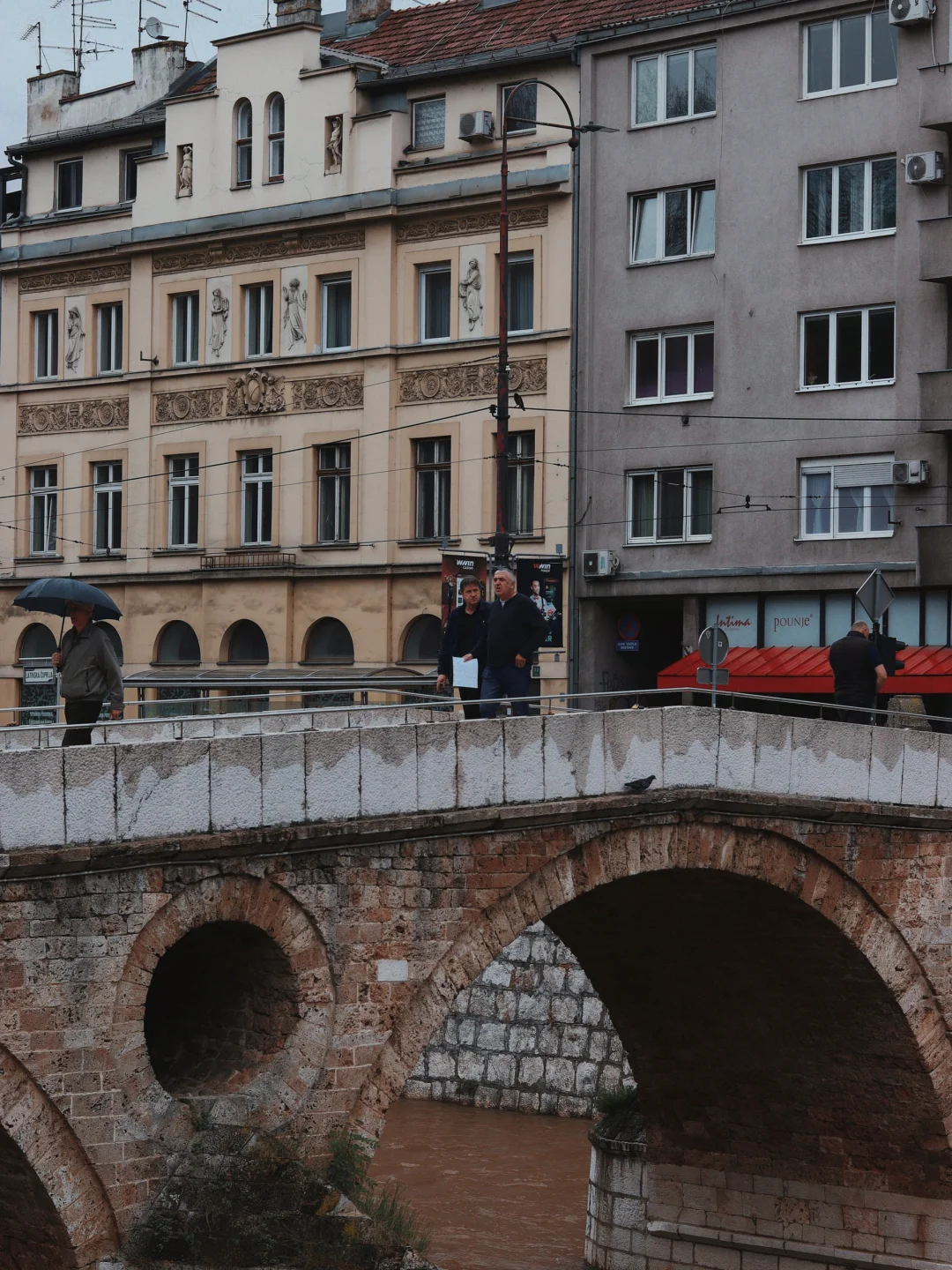 【中午】走过拉丁桥,看一旁墙壁上布满弹孔的建筑