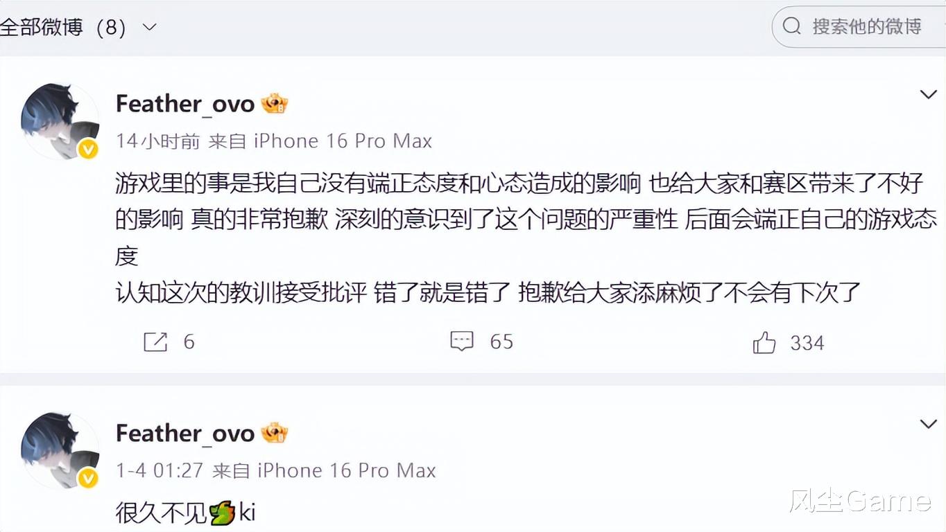 引发舆论之后,TT发布处罚公告:对Feather选手进行内部批评,处罚并扣除当月绩效,Feather本人也发文道歉:游戏里没有端正心态,给大家和赛区,造成了不好的影响,不会有下次了,打游戏红温谁都会有,但挂机是真不对,就算感觉赢不了,也不能消极游戏,希望能引以为戒吧。