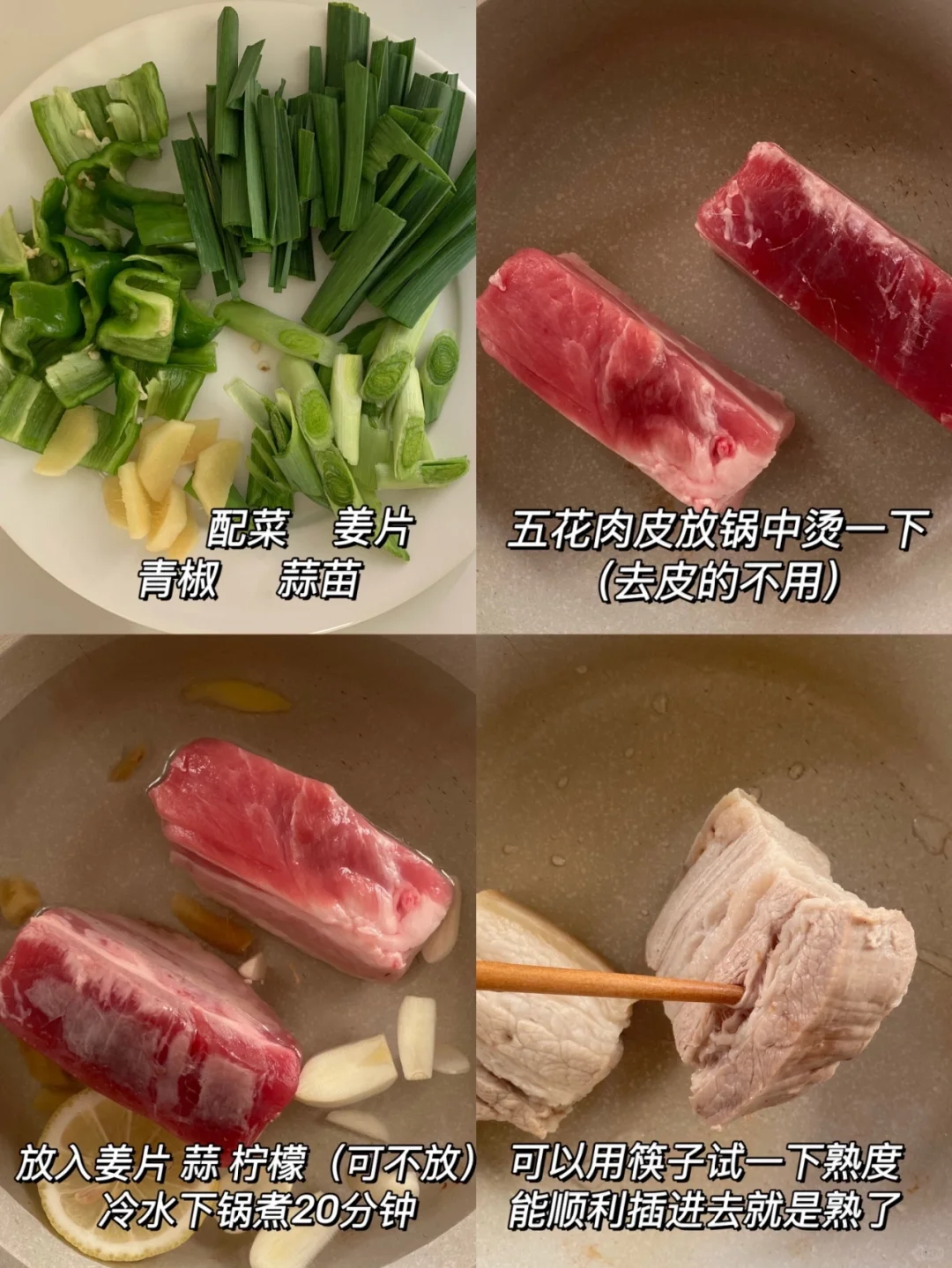 1⃣️五花肉烫一下猪皮,冷水下锅放入姜片蒜片煮20分钟