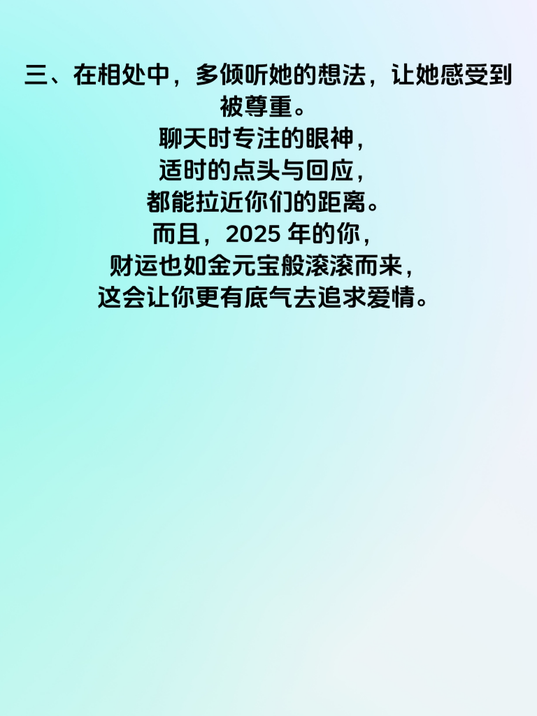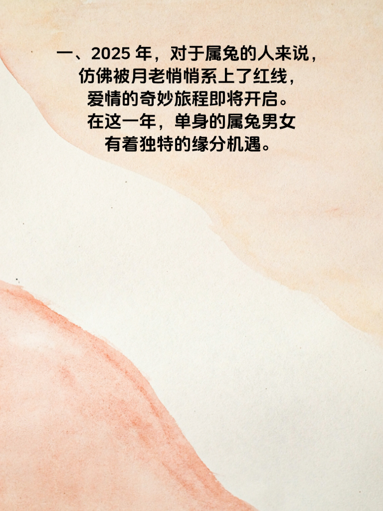 一、2025 年,对于属兔的人来说,仿佛被月老悄悄系上了红线,爱情的奇妙旅程即将开启。在这一年,单身的属兔男女有着独特的缘分机遇。 二、若你正追求心仪的女生,可要好好把握。首先,要展现出真诚与耐心。属兔的你本就心思细腻,更应将这份细腻用在关心她的点滴上。比如,记住她的喜好,在特别的日子送上一份贴心小礼物。 三、在相处中,多倾听她的想法,让她感受到被尊重。聊天时专注的眼神,适时的点头与回应,都能拉近你们的距离。而且,2025 年的你,财运也如金元宝般滚滚而来,这会让你更有底气去追求爱情。 四、不妨用这份财富为她创造一些浪漫回忆。带她去她向往已久的地方旅行,品尝精致的美食。同时,自身也要不断成长进步,提升内在魅力,这样才能在爱情的道路上越走越顺,与她携手走过美好的时光。