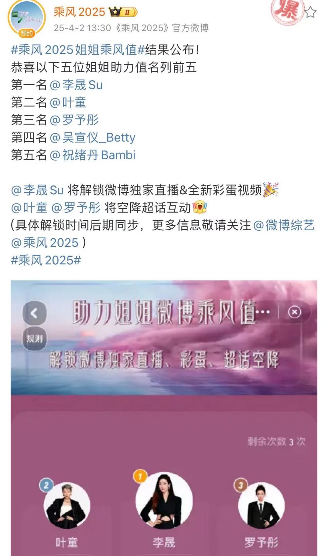 李晟[超话]李晟三次个人第一 恭喜李晟喜获微博喜爱度第一名,又拿下一个第一!这是在初舞台全民评级、乘风助力值之后的第三个第一名,太争气了!!!乘风2025