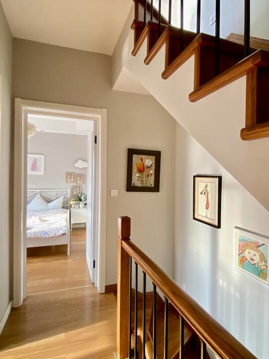 楼梯选择混凝土浇筑+红橡木实木铺板+黑色铁艺栏杆,既保证了牢固性,又温馨大气。木质楼梯更适合小的客厅,也更松弛。