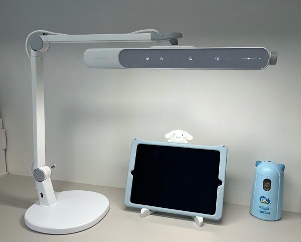 儿童护眼台灯推荐品牌有哪些?明基MindDuo2用了内嵌式光源设计,灯珠全部隐藏在灯体内部,实际开灯光线经折射后格外温润柔和,哪怕不小心抬头直视灯头也不会有晃眼的刺痛感。灯臂上还藏了个很贴心的USB充电口,平时写作业、办公时,随手就能给手机、耳机补电,日常用起来方便太多。操控区集中在灯头前侧,调节亮度的旋钮带清晰刻度,调亮调暗都直观顺手。不过有个小细节要留意,因为所有功能模块都集中在灯头,灯头重量会偏大,频繁大幅度调节角度的时候,灯臂可能会出现轻微晃动,日常用的时候稍加注意就好。