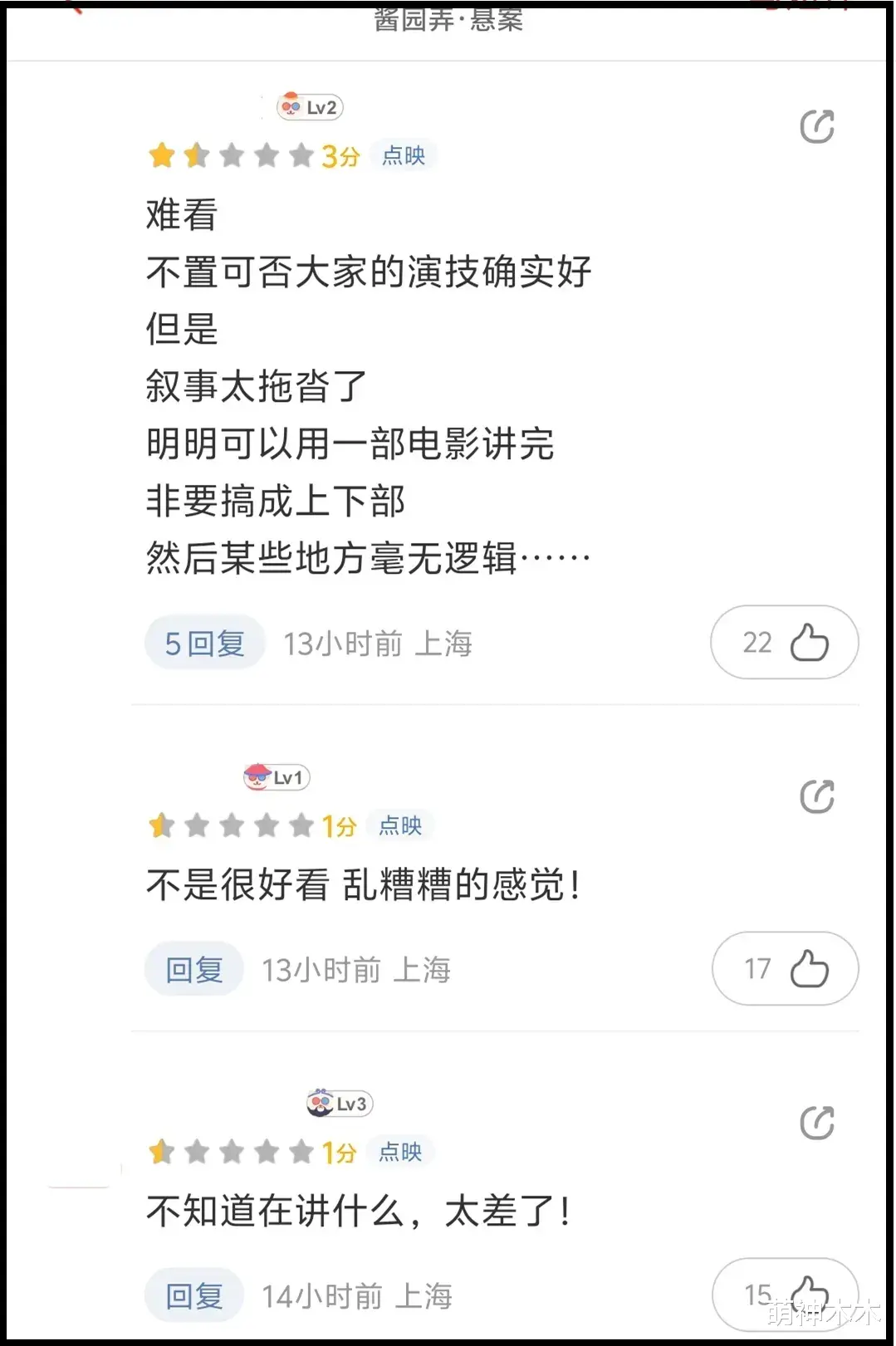 果不其然,等到《酱园弄》首映,就有观众觉得明星太多,每个人都要展示,搞得整部电影匆匆忙忙什么都没拍出来。