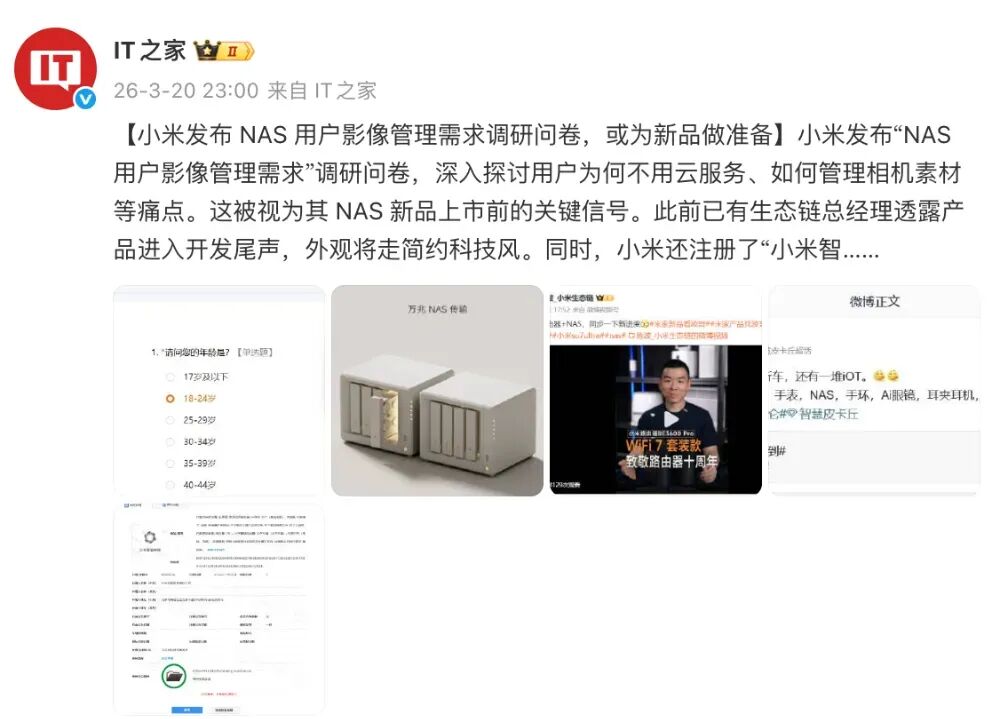 小米发布“NAS 用户影像管理需求”调研问卷,深入探讨用户为何不用云服务、如何管理相机素材等痛点。这被视为其 NAS 新品上市前的关键信号。