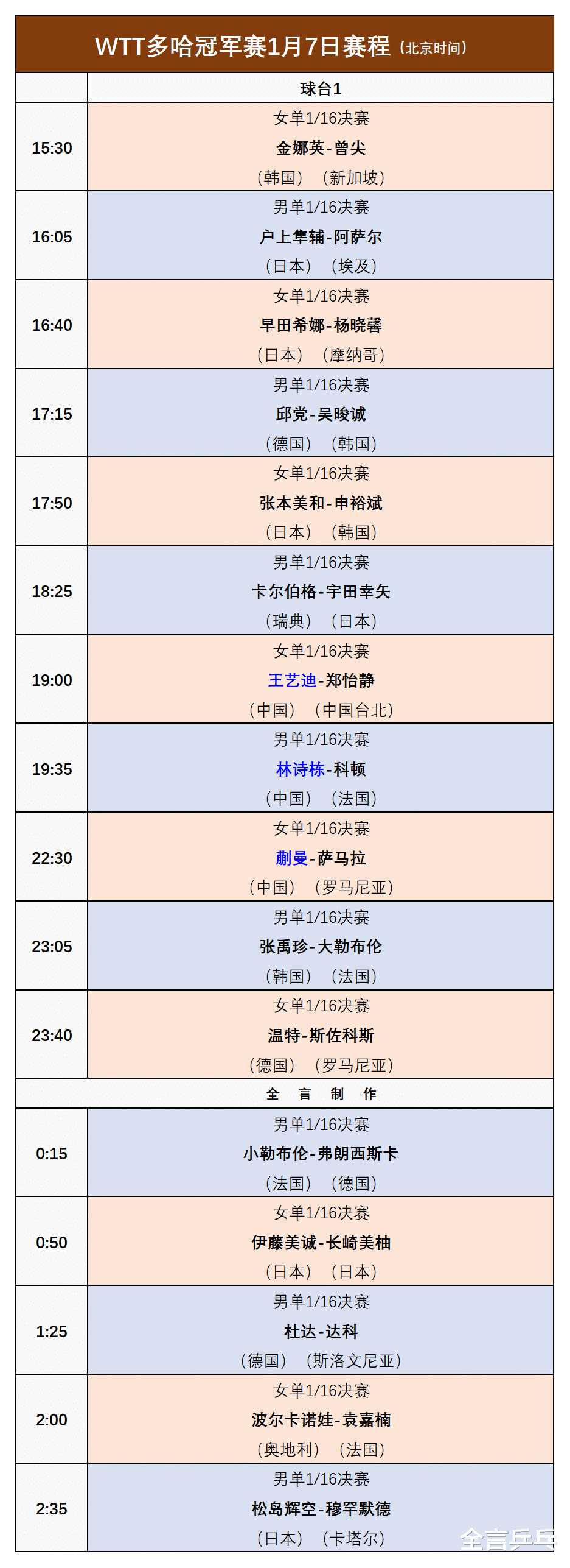 17:50,张本美和(日本)VS申裕斌(韩国);