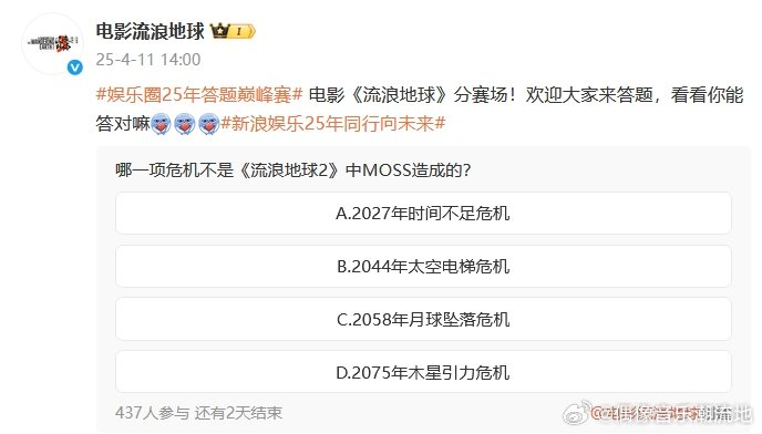 流浪地球2027时间不足危机出题了!问题来了:哪一项危机不是MOSS的锅?第一个选项是“2027年时间不足危机”,大家怎么看?哈哈,是不是在暗指导演还没开始拍?2027时间不足危机