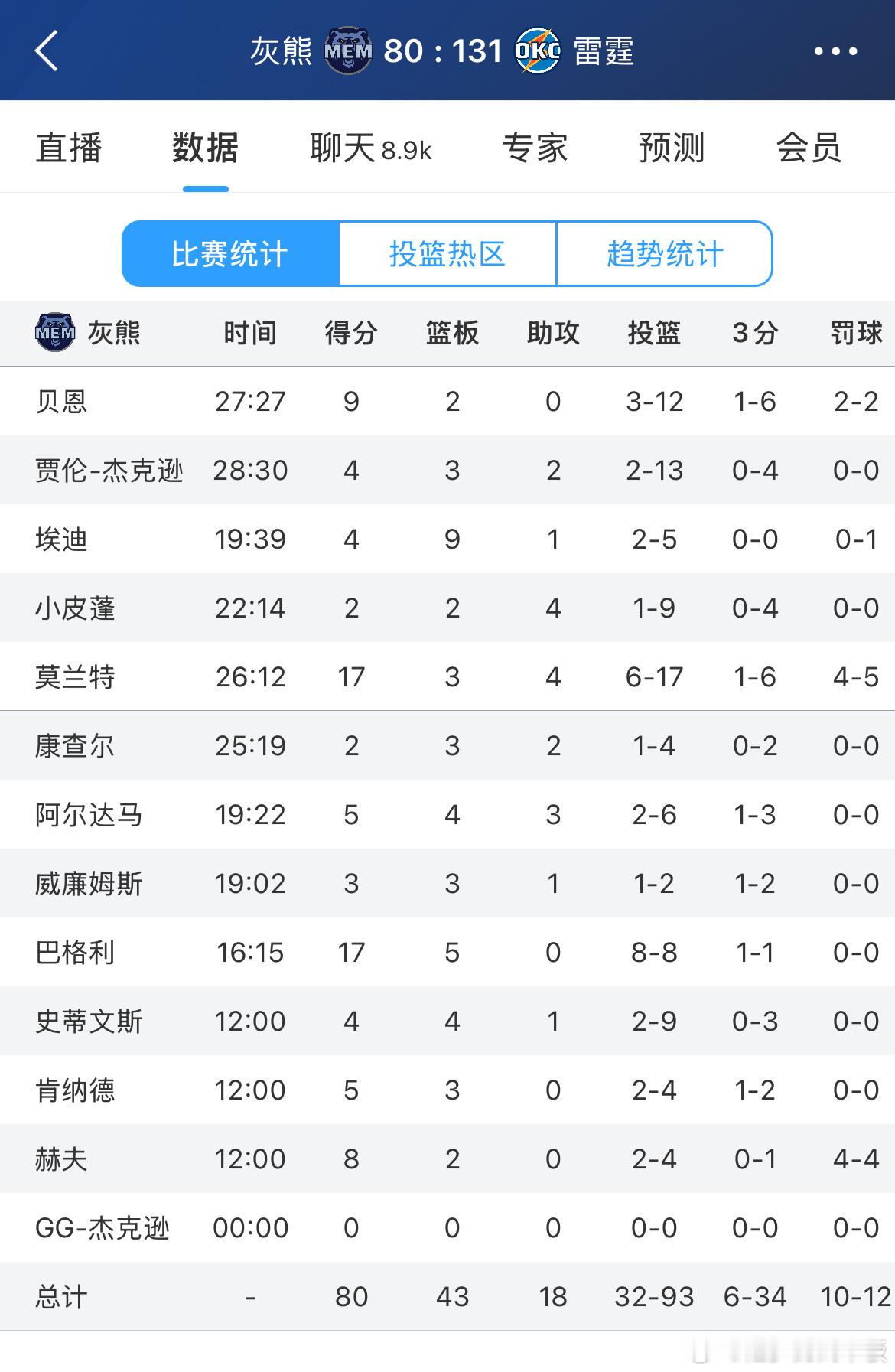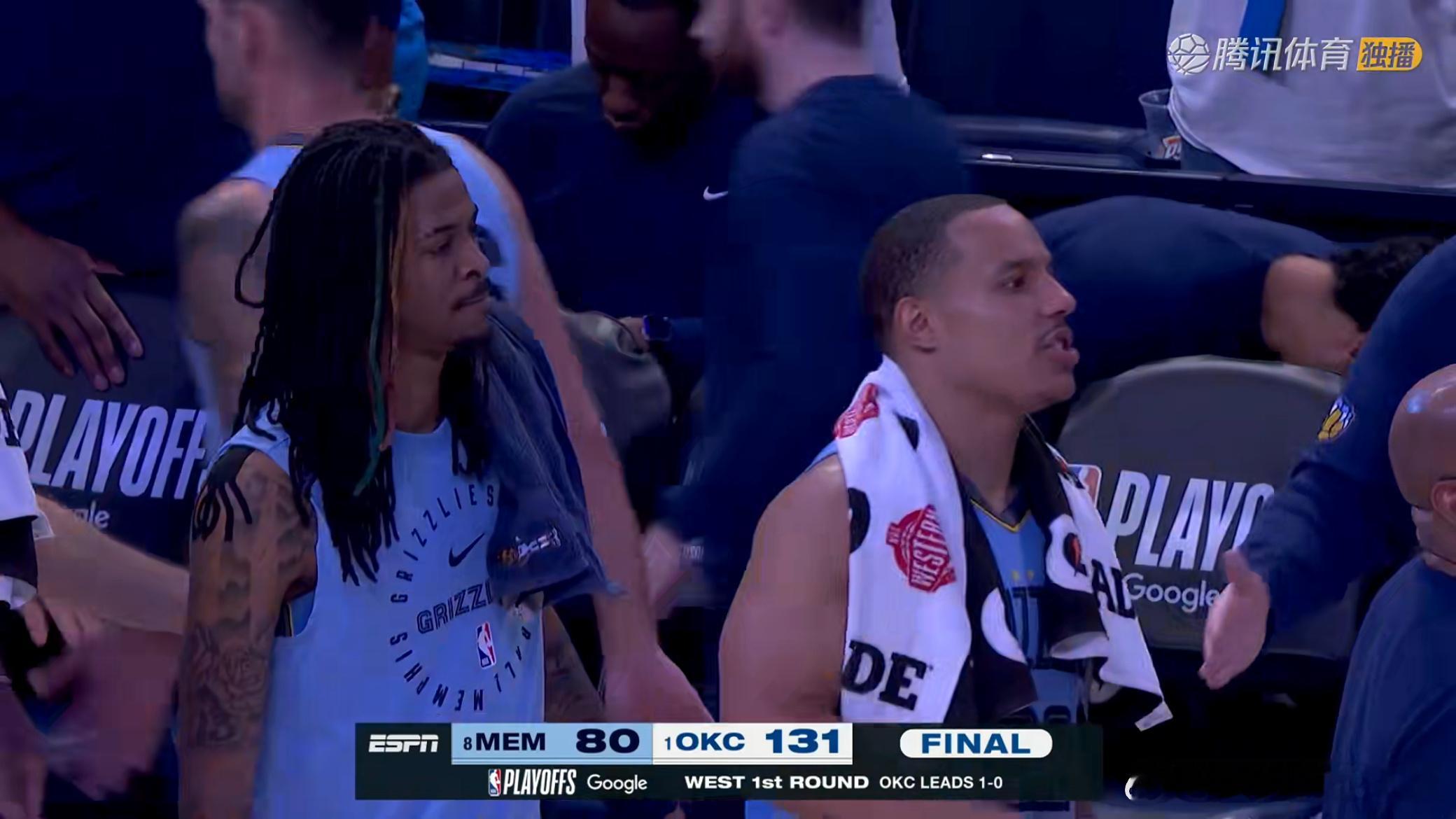 这创造了NBA季后赛G1最大分差的胜利,也是雷霆季后赛队史最大分差胜利灰熊vs雷霆