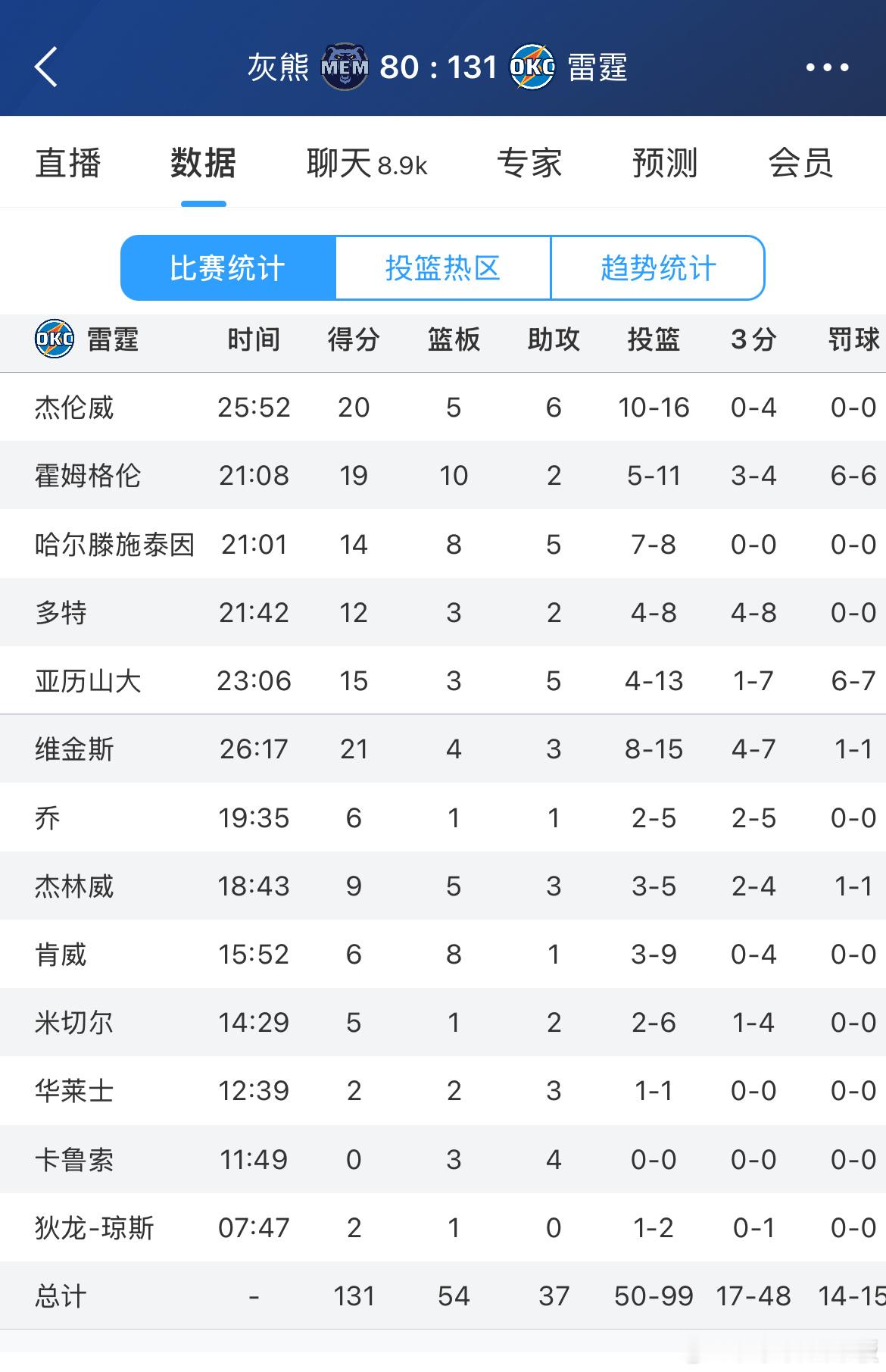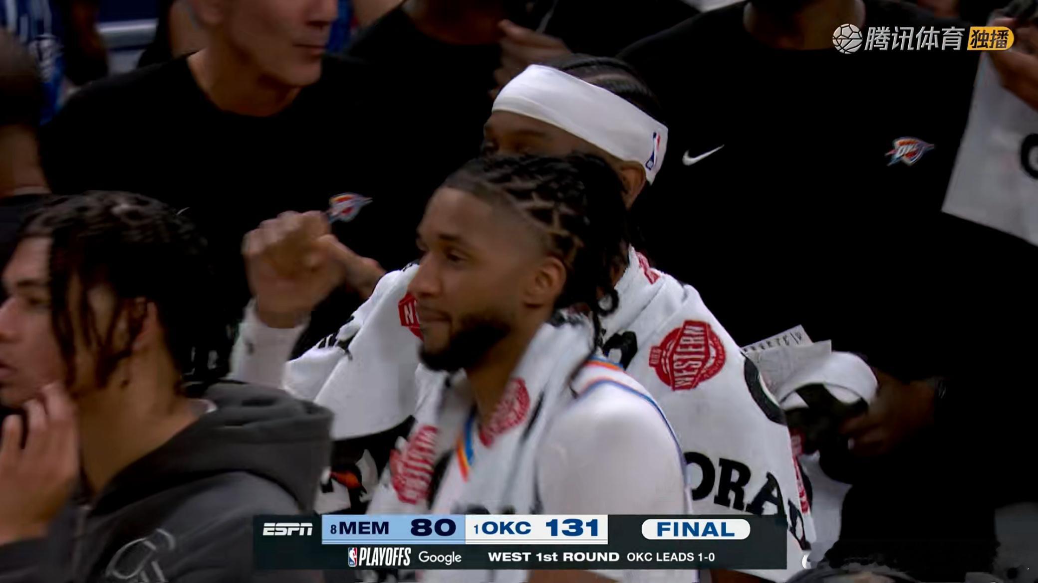 虐杀!雷霆131-80大胜灰熊!这创造了NBA季后赛G1最大分差的胜利,也是雷霆