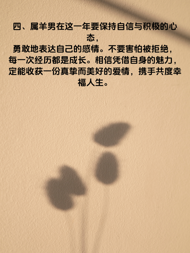 一、2025年,对于属羊男来说,是充满希望与美好的一年。情运顺遂,意味着他们在爱情之路上将迎来诸多甜蜜与温馨。这一年,他们更容易遇到那个与自己灵魂契合的她,爱情的火花会在不经意间点燃。 二、在追求女生时,属羊男的温柔与细腻会成为他们的有力武器。他们懂得倾听女生的心声,给予对方充分的理解与关怀,让女生在相处中感受到满满的爱意与尊重。 三、而且,2025年属羊男财势稳中有升,这为他们的爱情增添了更多保障。他们可以为心爱的人提供更好的生活条件,一起去看更美的风景,享受更多的浪漫时光。 四、属羊男在这一年要保持自信与积极的心态,勇敢地表达自己的感情。不要害怕被拒绝,每一次经历都是成长。相信凭借自身的魅力,定能收获一份真挚而美好的爱情,携手共度幸福人生。