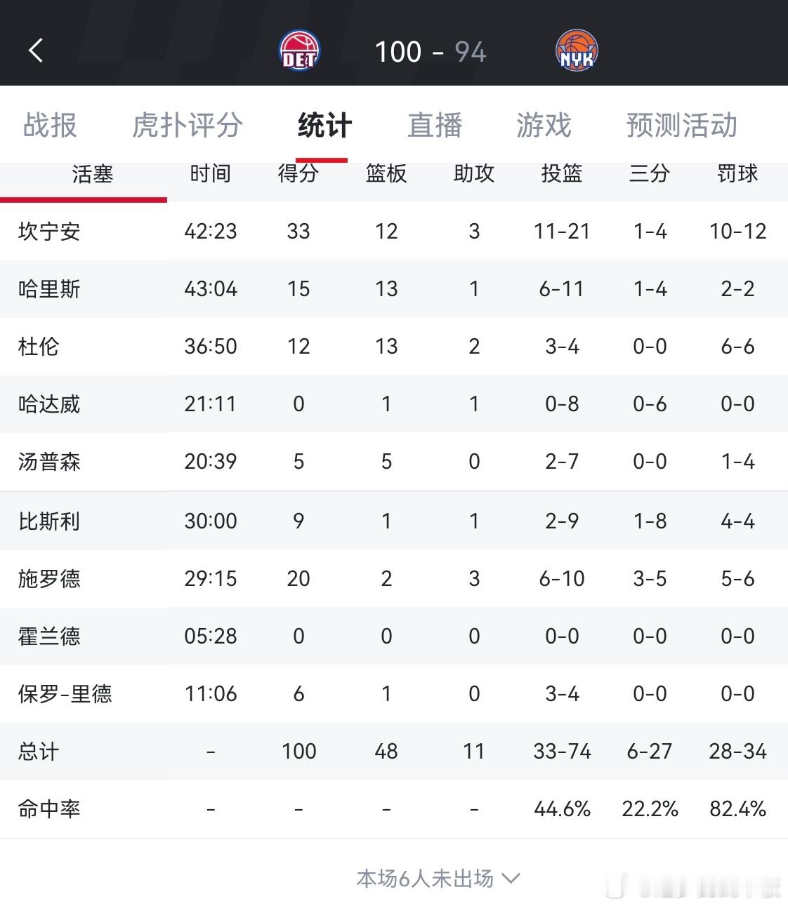 活塞100-94客场击败尼克斯!大比分追至1-1坎宁安33分12板,施罗德替补贡