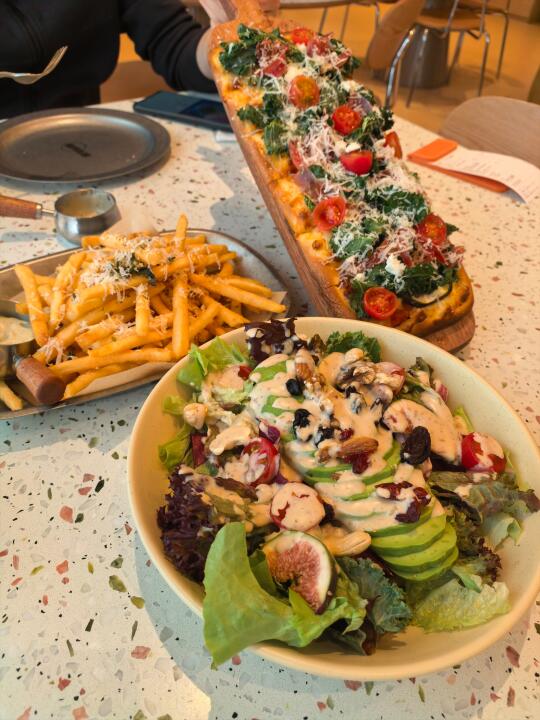 没想到番禺新造良仓的创意园内竟然开了一家可以集健身🏋️攀岩🧗西餐融合菜🍴的好地方! 🥑牛油果混合沙拉 搭配均衡,水果蔬菜🥬新鲜,适合健身人员! 🍟美式薯条配羊奶塔塔酱 这种口味的薯条还是第一次吃,很清新的感觉,搭配酱真的吃得停不下来。 🍝黑松露培根🥓意面拌温泉蛋 意面很弹,🈶淡淡的奶香味融合黑松露,意面也太香了。 Ps:听说这里攀岩的是巴黎奥运会同款的岩壁,合理布局,难度分区合理,很适合攀岩爱好者。 🏠PURELINK SKITCHEN普岚私厨 📍番禺区和平路1号7号仓 🚇地铁4号线新造站