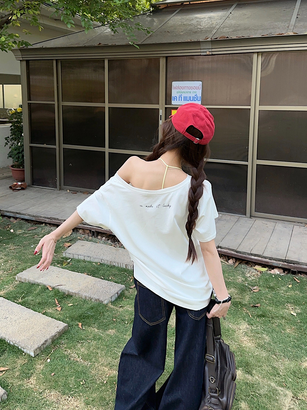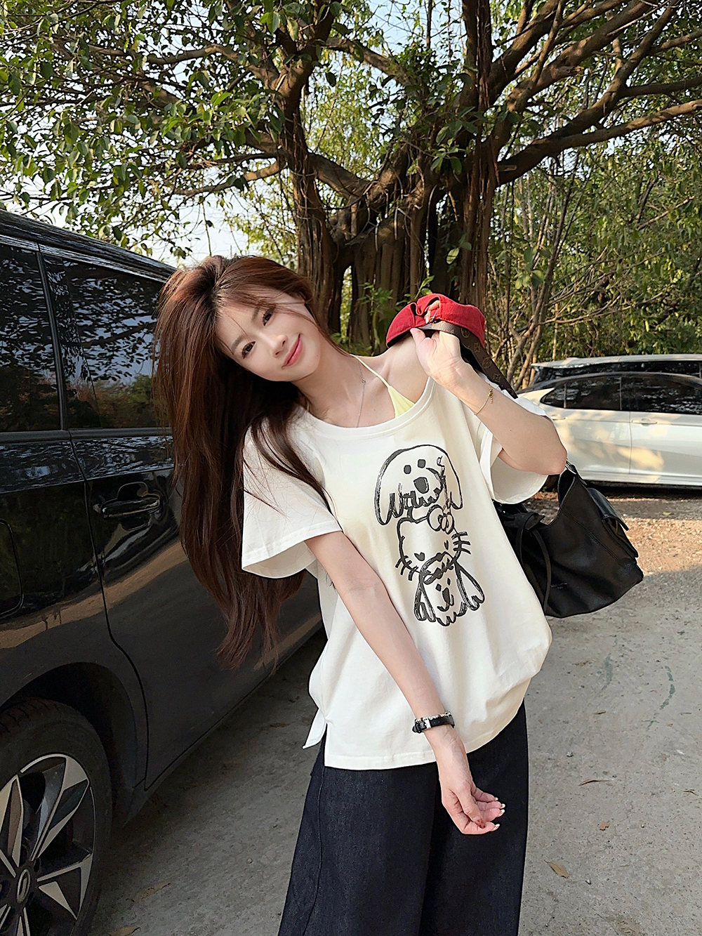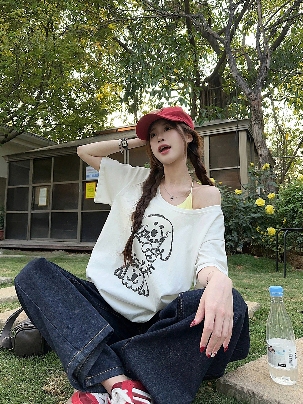 个性美式猫咪印花,白色斜肩设计,时尚开叉显瘦,展现独特魅力。