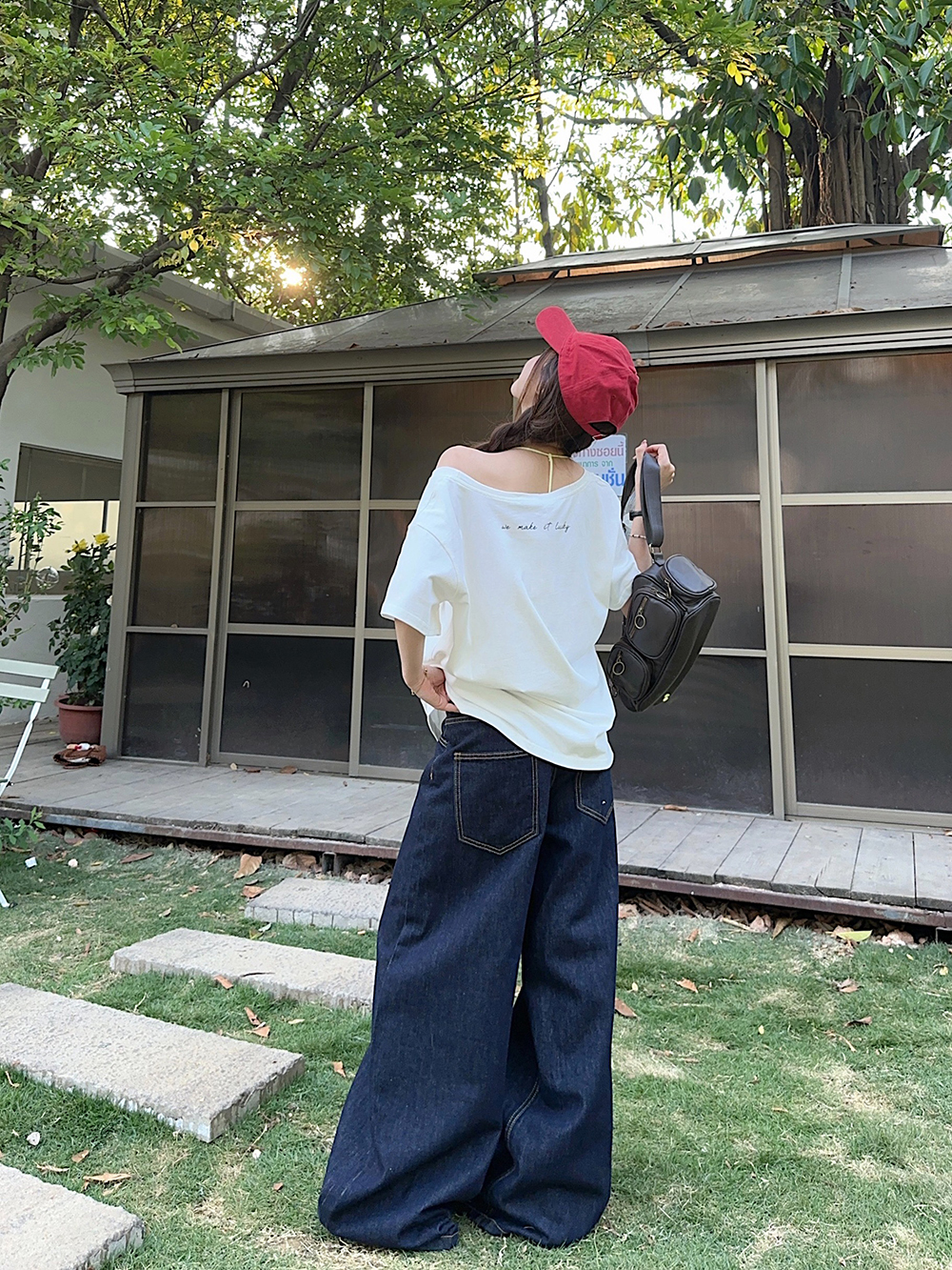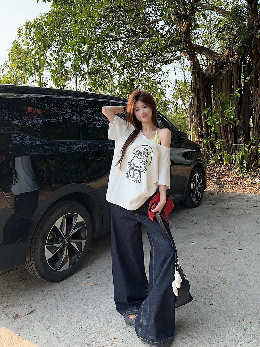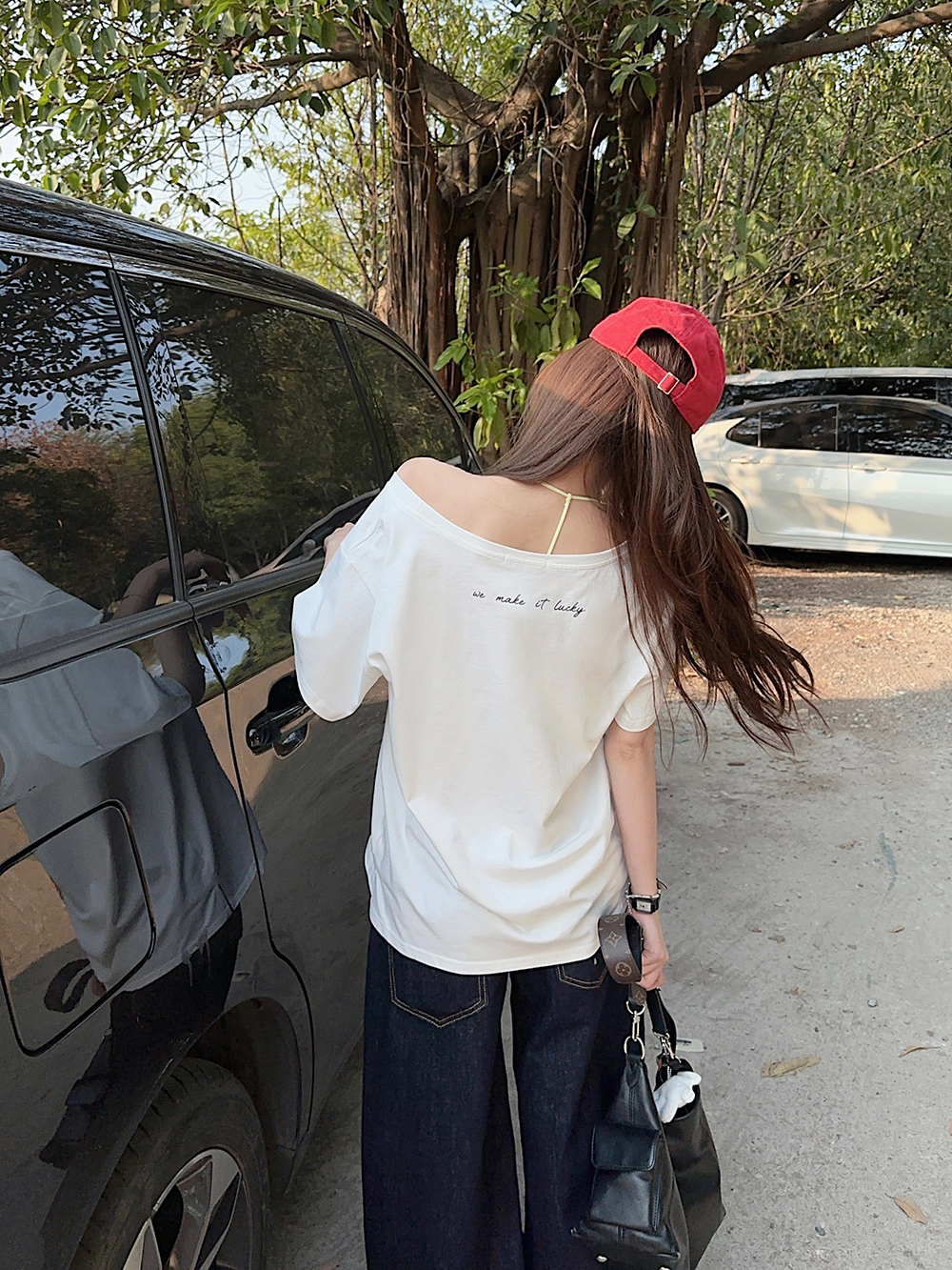 个性美式猫咪印花,白色斜肩设计,时尚开叉显瘦,展现独特魅力。