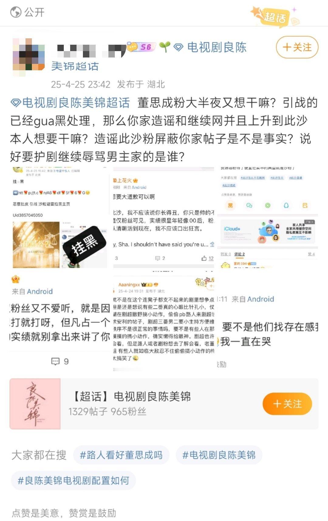 此沙粉丝喊话董思成粉丝护剧,起因是此沙和董思成正在合拍《良陈美锦》,某个被此沙家挂黑的粉丝可能👄了董思成,造成董思成粉丝不断诋毁此沙外形……