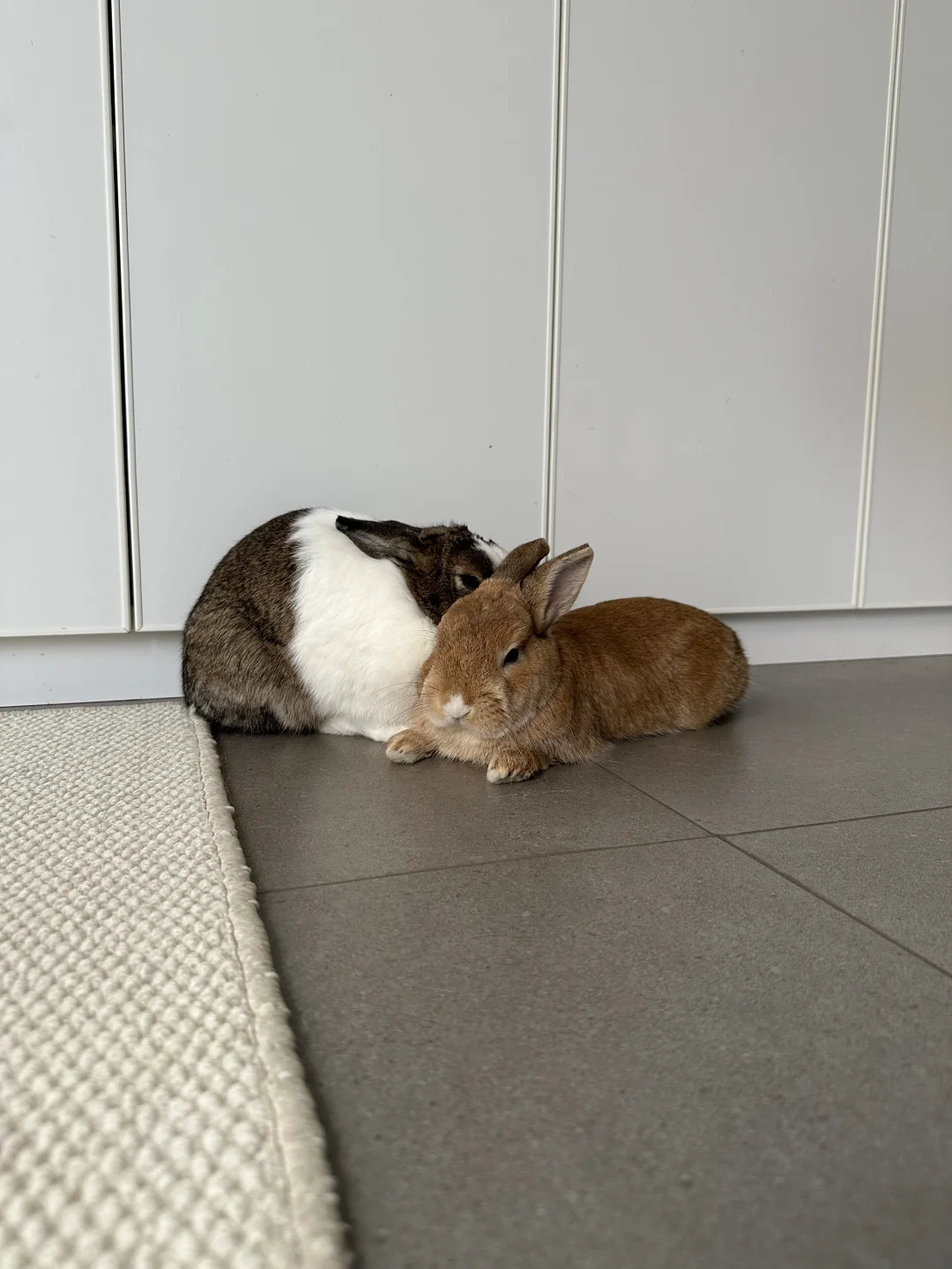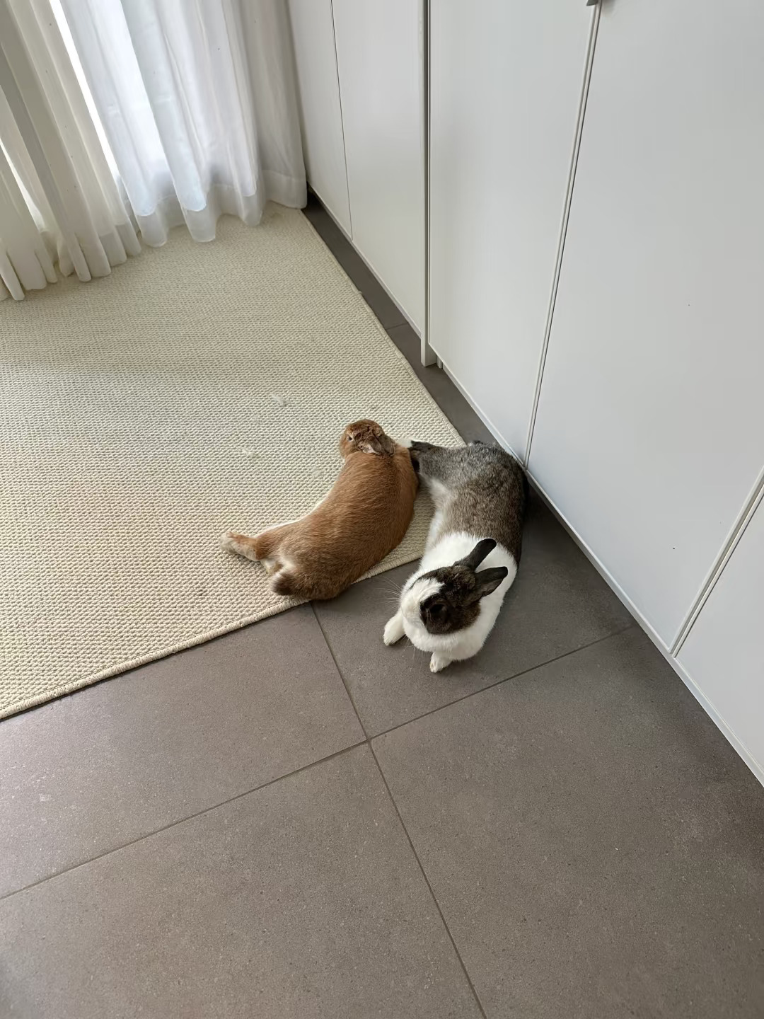 自从外婆回家后两只就把放饭的目标转移到我身上了,一到点就进房间来,一只先跳上床另一只负责挖角落或者弄窗帘引起注意,不理它们会消停一会儿但最多一小时,只要我一说话立马弄的更响,最终就等我下床立马跟着我跑出去,小兔的计划得逞吃饱继续睡觉