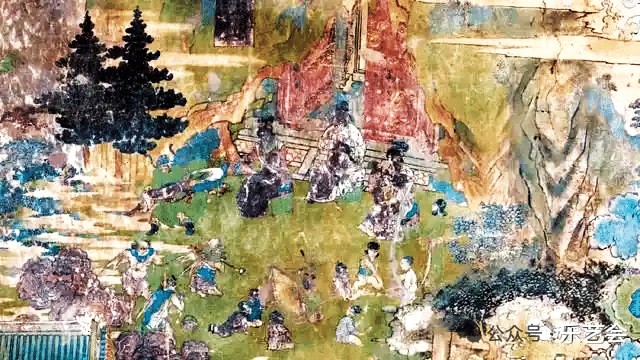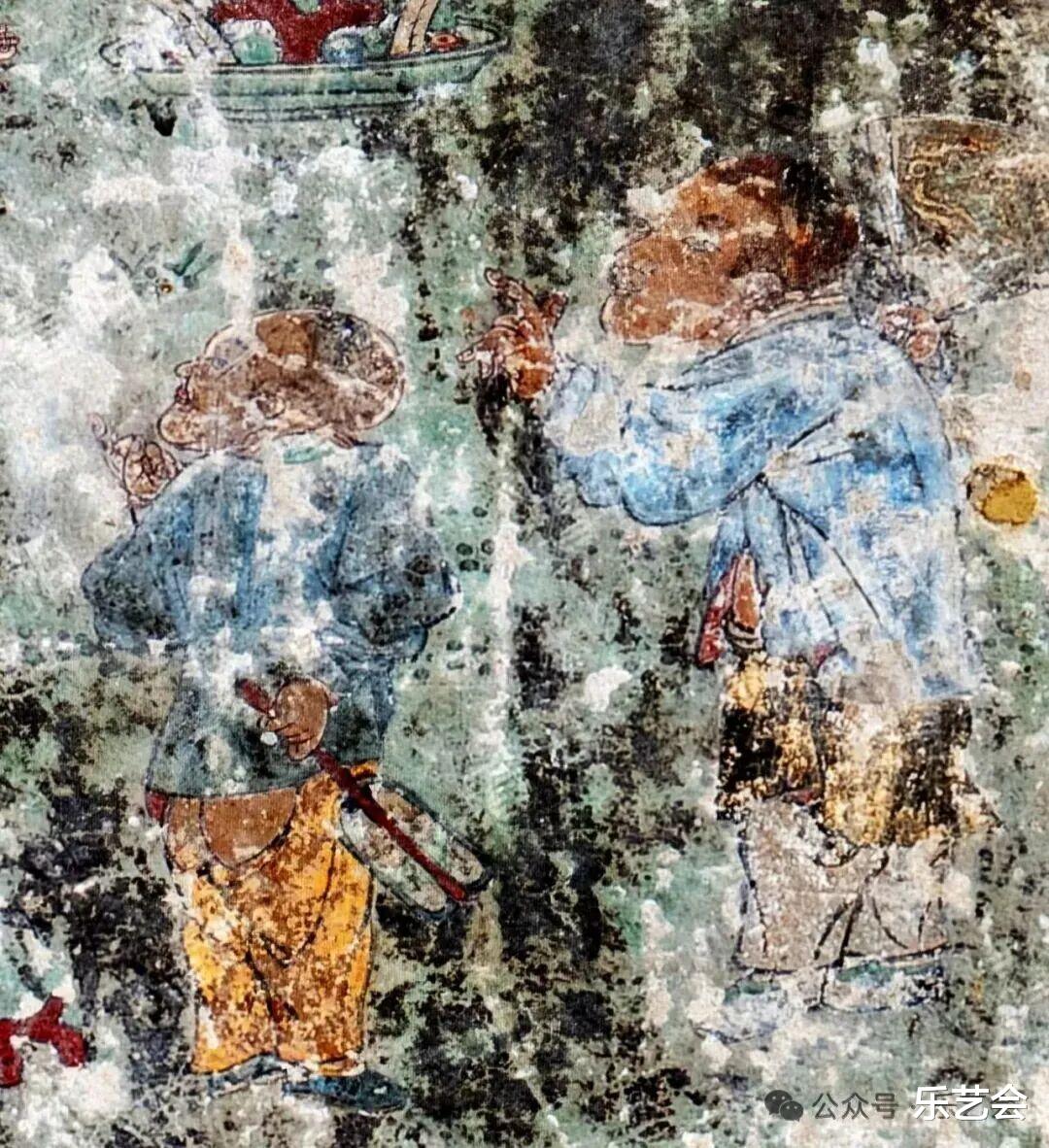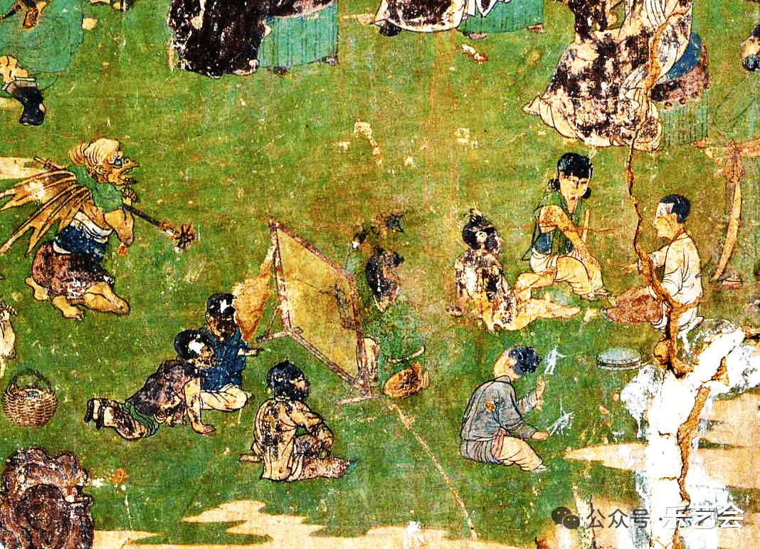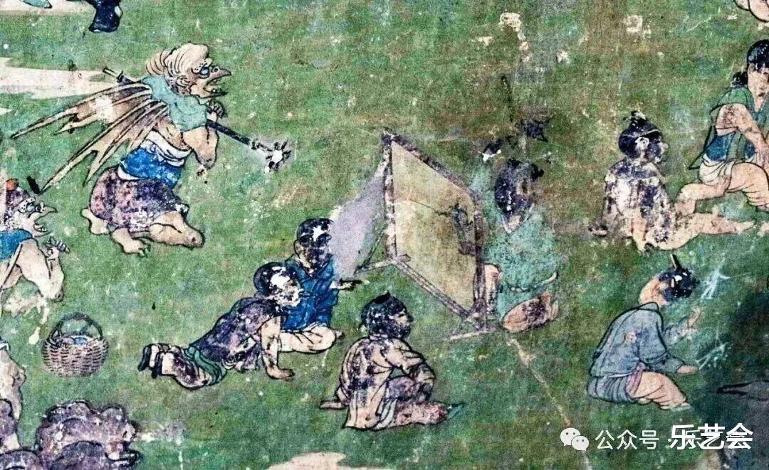 图中的“众艺童子”,有的击鼓、有的拍板、有的吹笛,有的念卷;有的耍枪、斗狗。