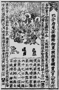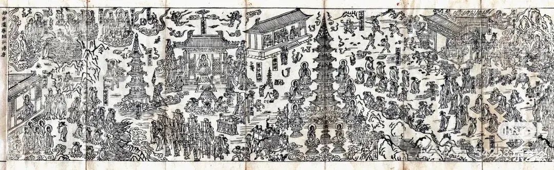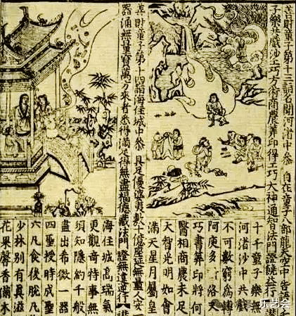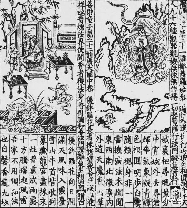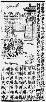 南宋临安刊行的《佛国禅师文殊指南图赞》(一称五十三参图赞)在版画史上十分珍贵。他以类似连环画式的连相方式,呈现佛教《华严经》中“善财童子五十三参”故事,表现善财童子经文殊菩萨指点,参拜和请教五十三处见识高深的菩萨和高人的故事。该书署“中书舍人张商英述”,张为北宋宰相,此乃临安书坊的工匠绘刻。“图赞”原书仅存于日本京都的大谷大学。