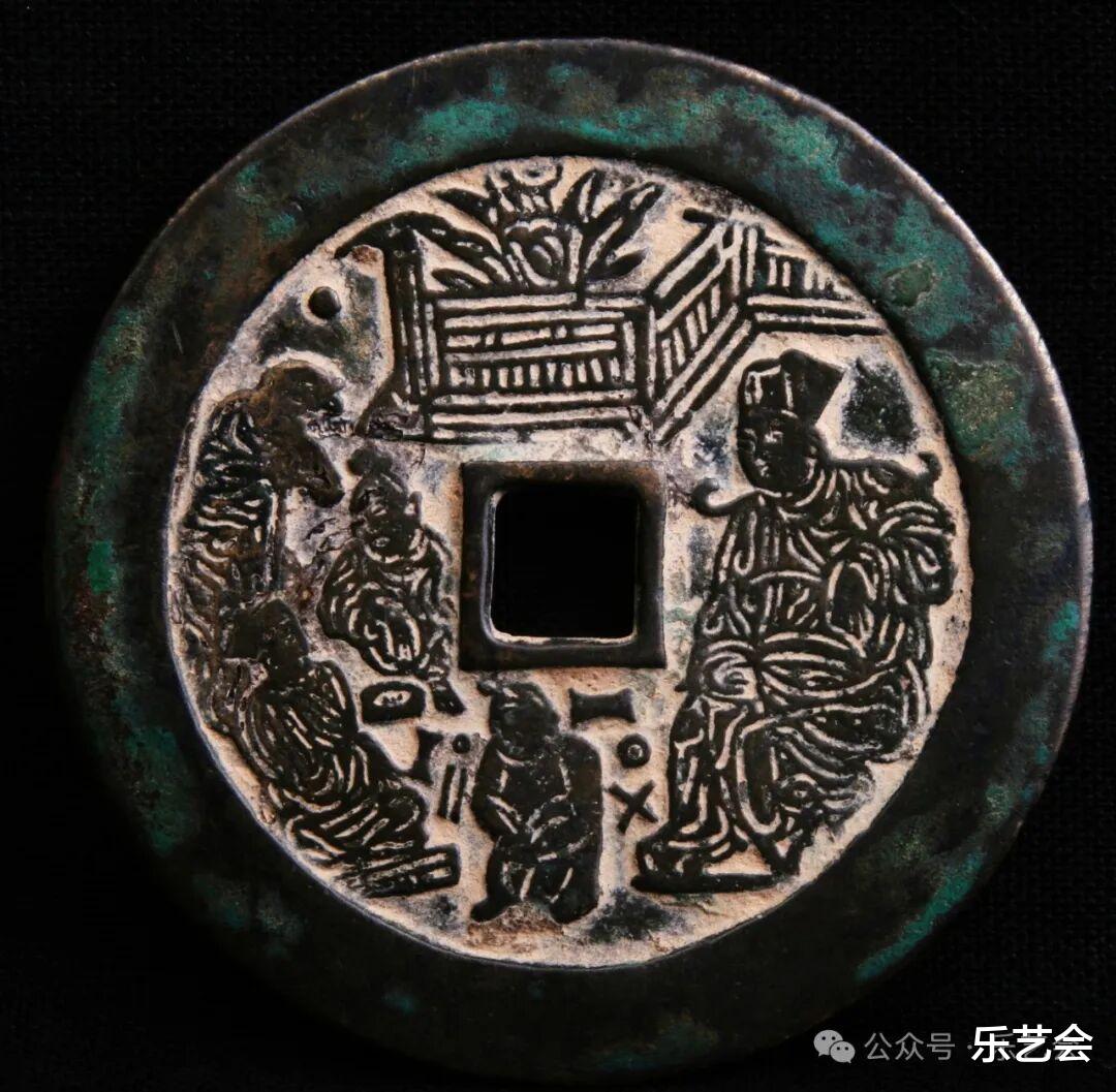 以上的画面构图,布局与要素组成,与本文所聚焦的中古庭院嬉戏花钱的布局要素,基本契合。双方都有庭院要素,其中所强化的庭院要素为曲栏和蕉叶,也分别对应。主要人物,都是一个戴三山帽的坐在坐具上,周围都是环绕着小孩子。小孩子在纸本上是在礼佛,或者在崇佛,而在花钱上也存在在拱手礼敬的可能。